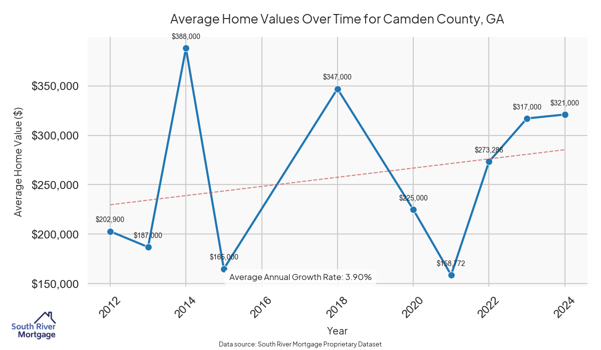 In 2024, there were 29 active reverse mortgage loans in Camden County, Georgia. The average home value in Camden County is $326,815.93.