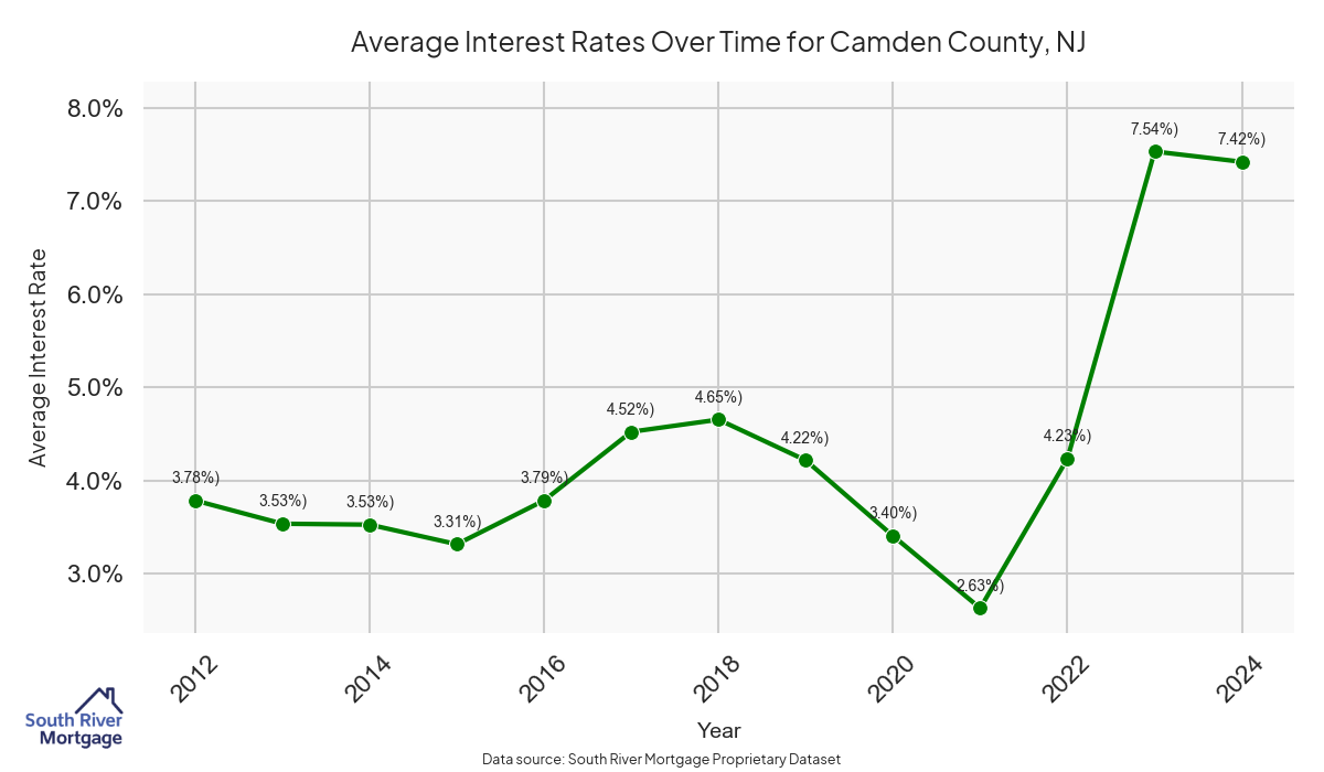 There are approximately 418 active reverse mortgage loans in Camden County. The average interest rate in Camden County is 7.54% for reverse mortgages. The average maximum claim amount (the lesser of the appraisal or lending limit), among reverse mortgage borrowers, in Camden County was $339,857.14 in 2024.
