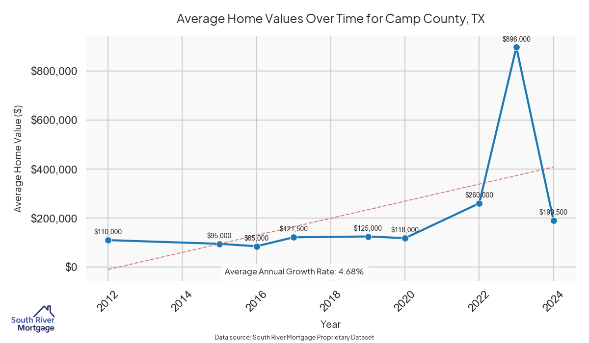 In 2024, there were 10 active reverse mortgage loans in Camp County, Texas. The average home value in Camp County is $292,443.60.
