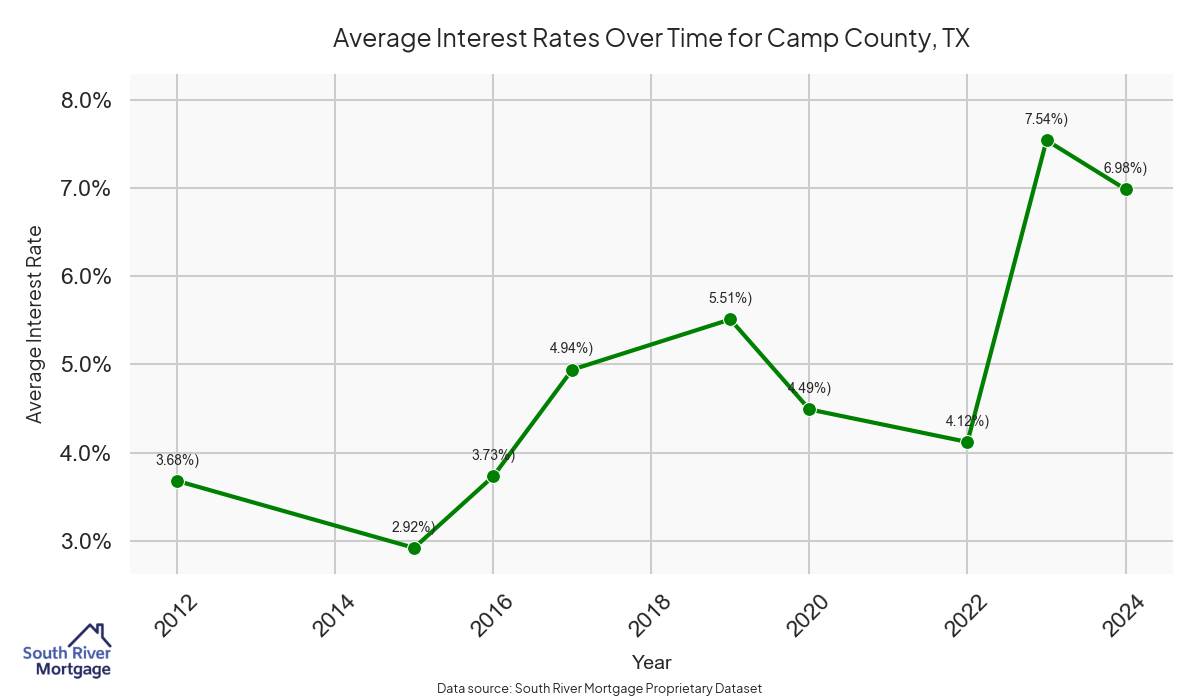 There are approximately 10 active reverse mortgage loans in Camp County. The average interest rate in Camp County is 7.54% for reverse mortgages. The average maximum claim amount (the lesser of the appraisal or lending limit), among reverse mortgage borrowers, in Camp County was $895,000.00 in 2024.
