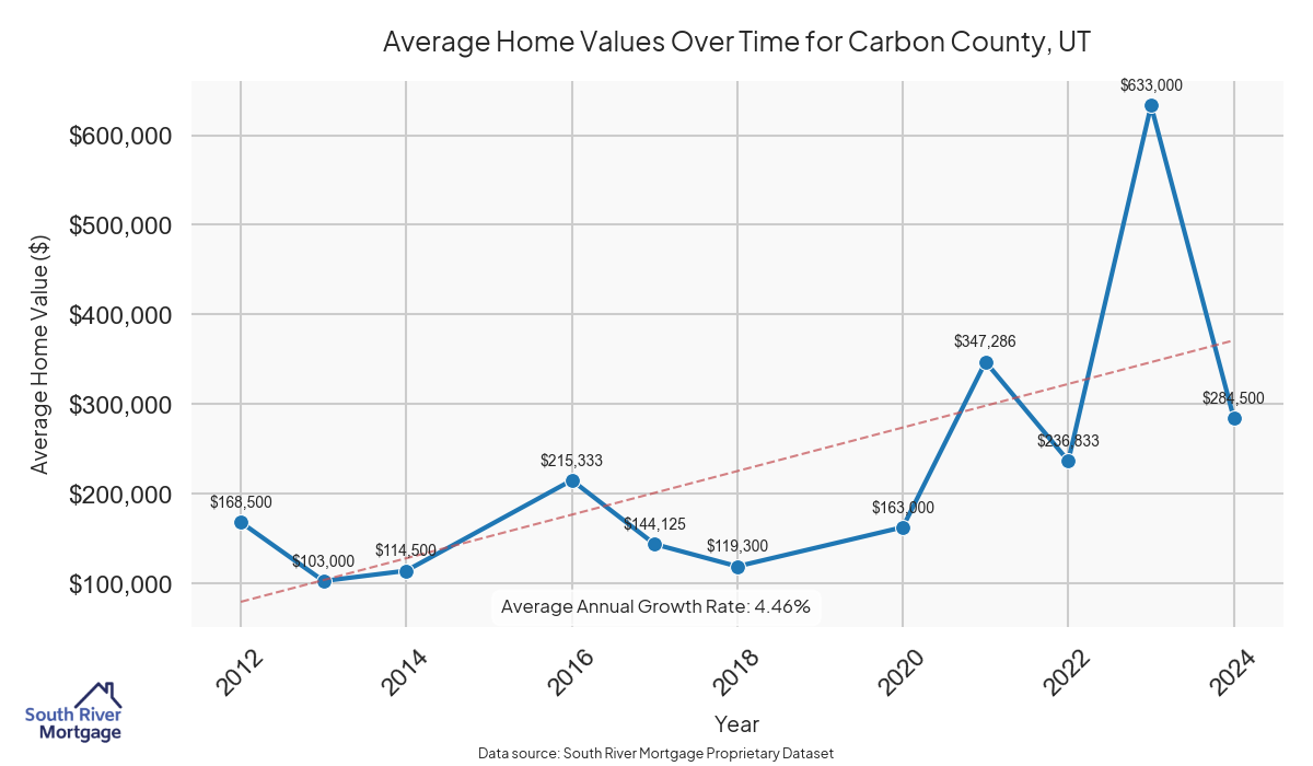 In 2024, there were 39 active reverse mortgage loans in Carbon County, Utah. The average home value in Carbon County is $351,721.97.