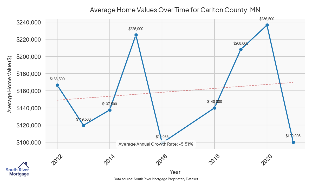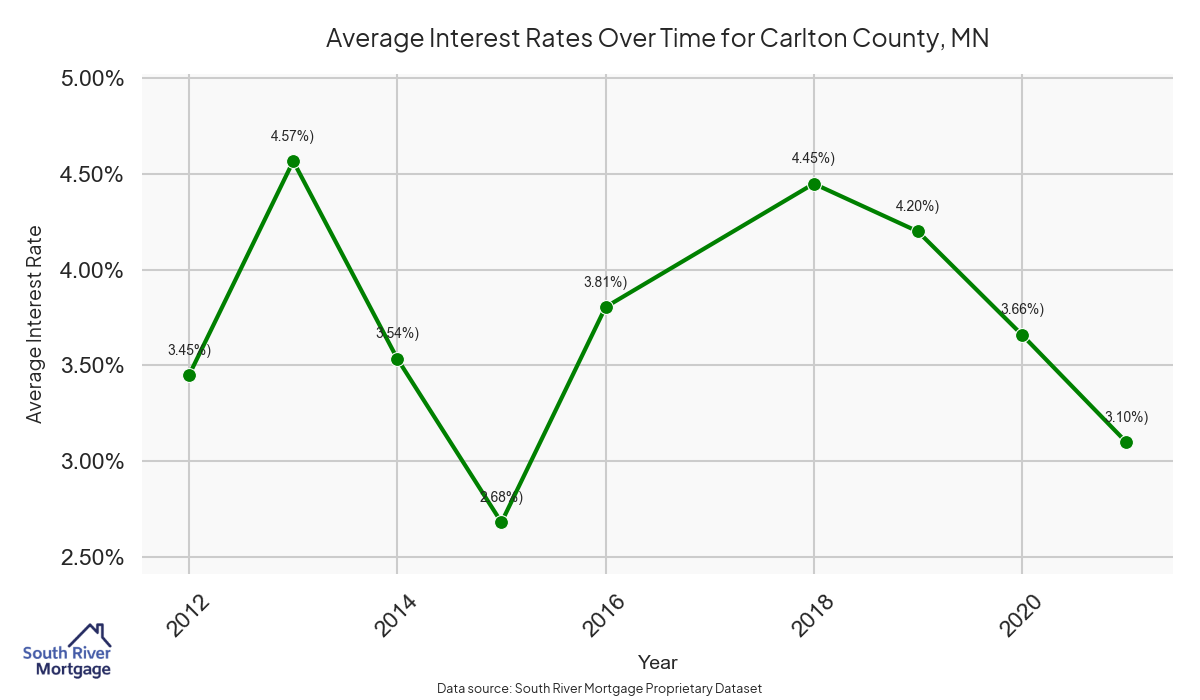 There are approximately 16 active reverse mortgage loans in Carlton County. The average interest rate in Carlton County is 8.07% for reverse mortgages. The average maximum claim amount (the lesser of the appraisal or lending limit), among reverse mortgage borrowers, in Carlton County was $165,000.00 in 2024.