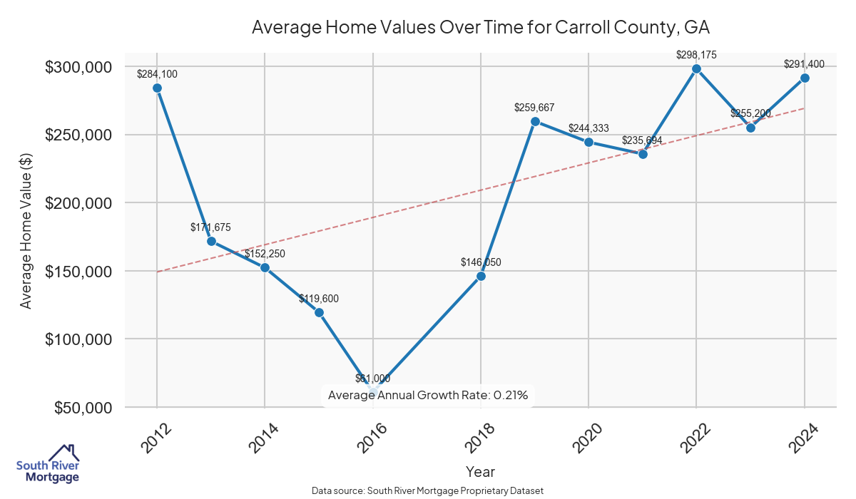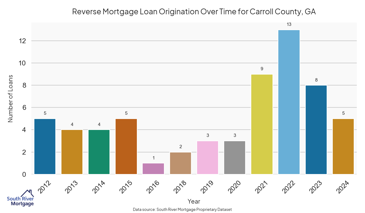 In 2024, there were 62 active reverse mortgage loans in Carroll County, Georgia. The average home value in Carroll County is $326,974.74.