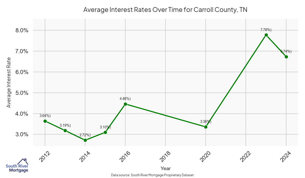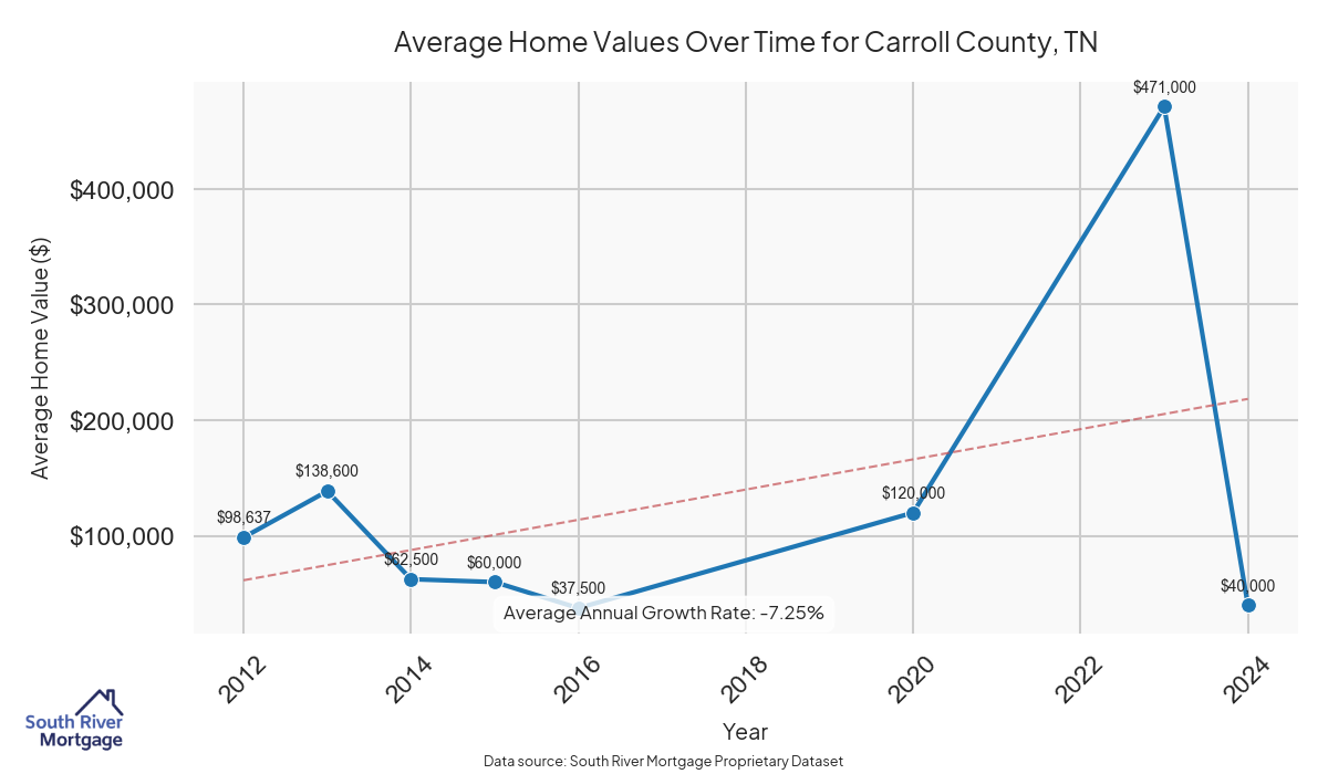 In 2024, there were 19 active reverse mortgage loans in Carroll County, Tennessee. The average home value in Carroll County is $174,320.84.