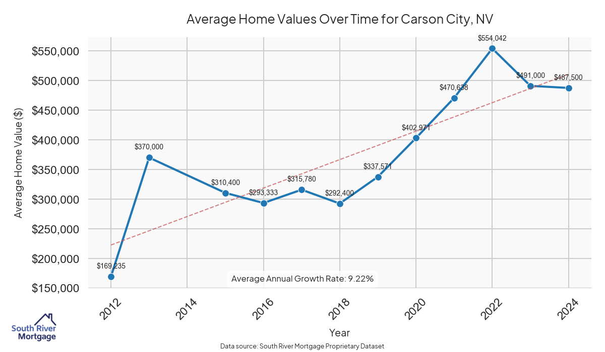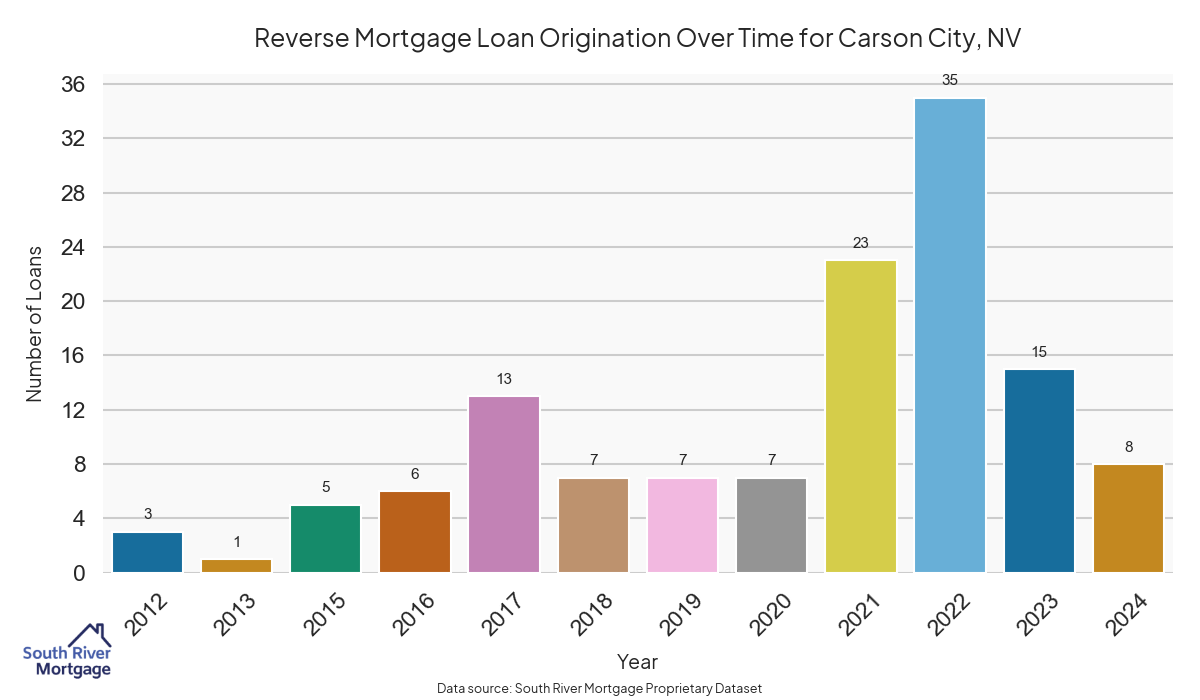 In 2024, there were 128 active reverse mortgage loans in Carson City, Nevada. The average home value in Carson City is $548,009.72.