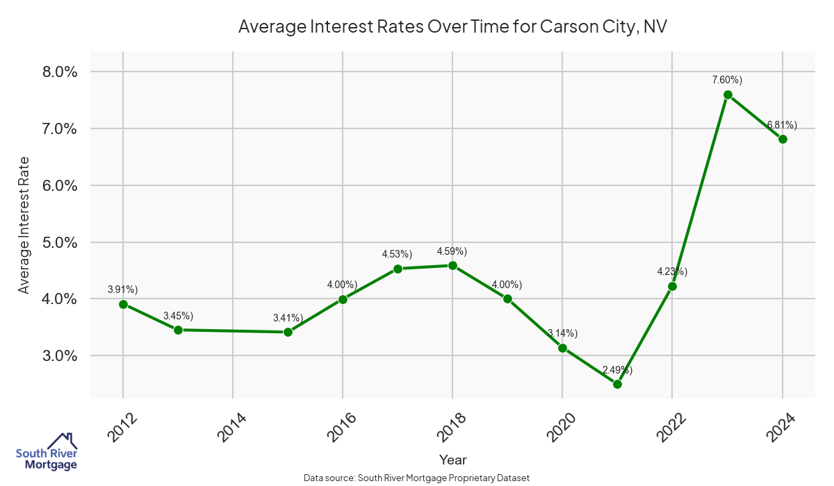 There are approximately 128 active reverse mortgage loans in Carson City. The average interest rate in Carson City is 7.52% for reverse mortgages. The average maximum claim amount (the lesser of the appraisal or lending limit), among reverse mortgage borrowers, in Carson City was $534,473.68 in 2024.