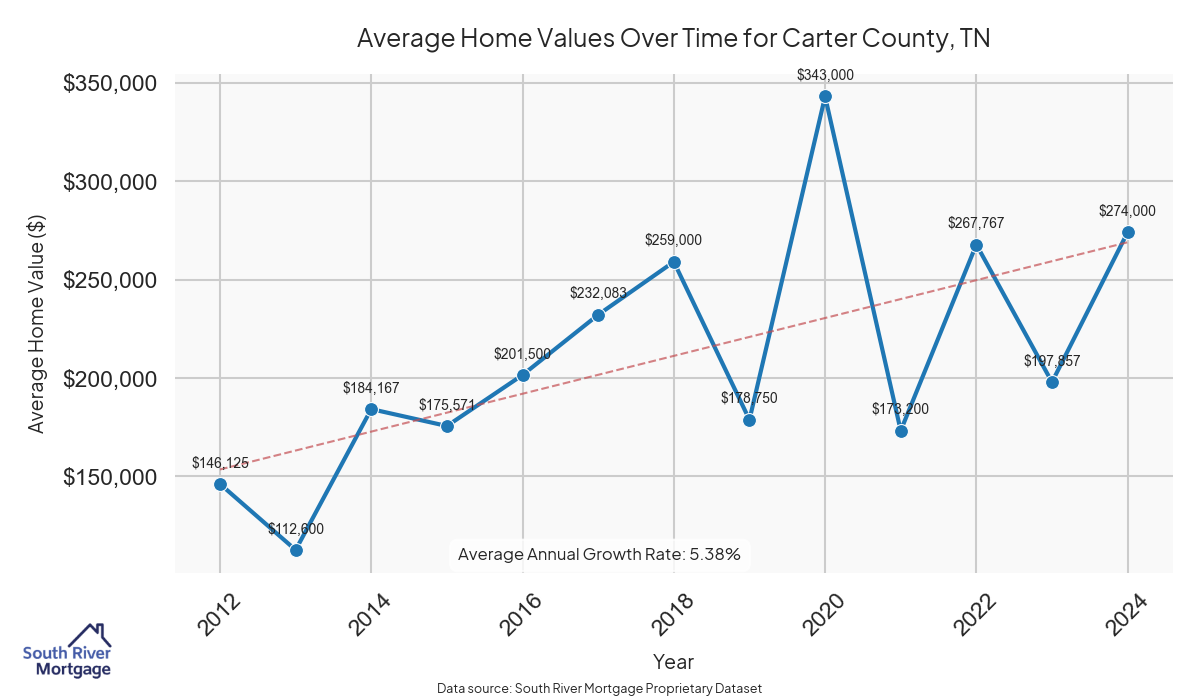 In 2024, there were 59 active reverse mortgage loans in Carter County, Tennessee. The average home value in Carter County is $249,087.02.