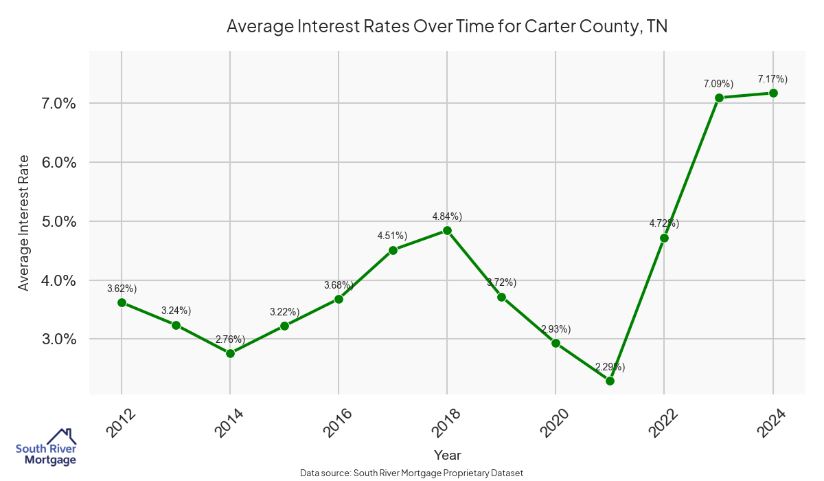 There are approximately 59 active reverse mortgage loans in Carter County. The average interest rate in Carter County is 7.28% for reverse mortgages. The average maximum claim amount (the lesser of the appraisal or lending limit), among reverse mortgage borrowers, in Carter County was $220,000.00 in 2024.