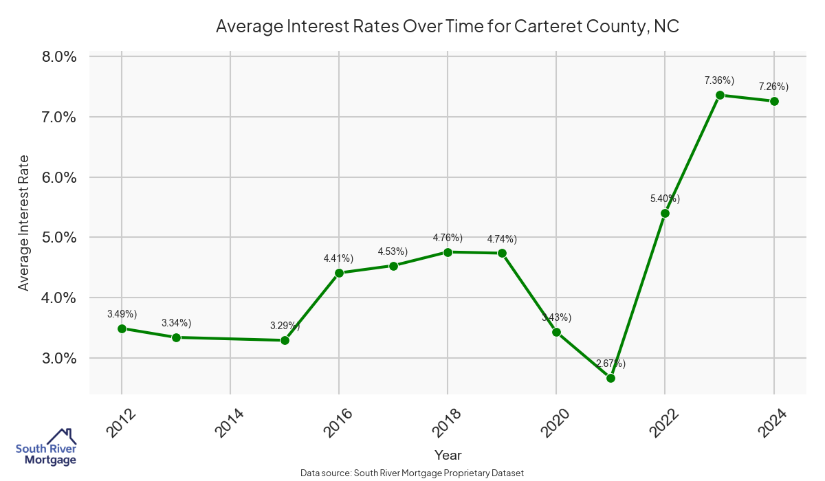 There are approximately 103 active reverse mortgage loans in Carteret County. The average interest rate in Carteret County is 7.57% for reverse mortgages. The average maximum claim amount (the lesser of the appraisal or lending limit), among reverse mortgage borrowers, in Carteret County was $821,363.64 in 2024.
