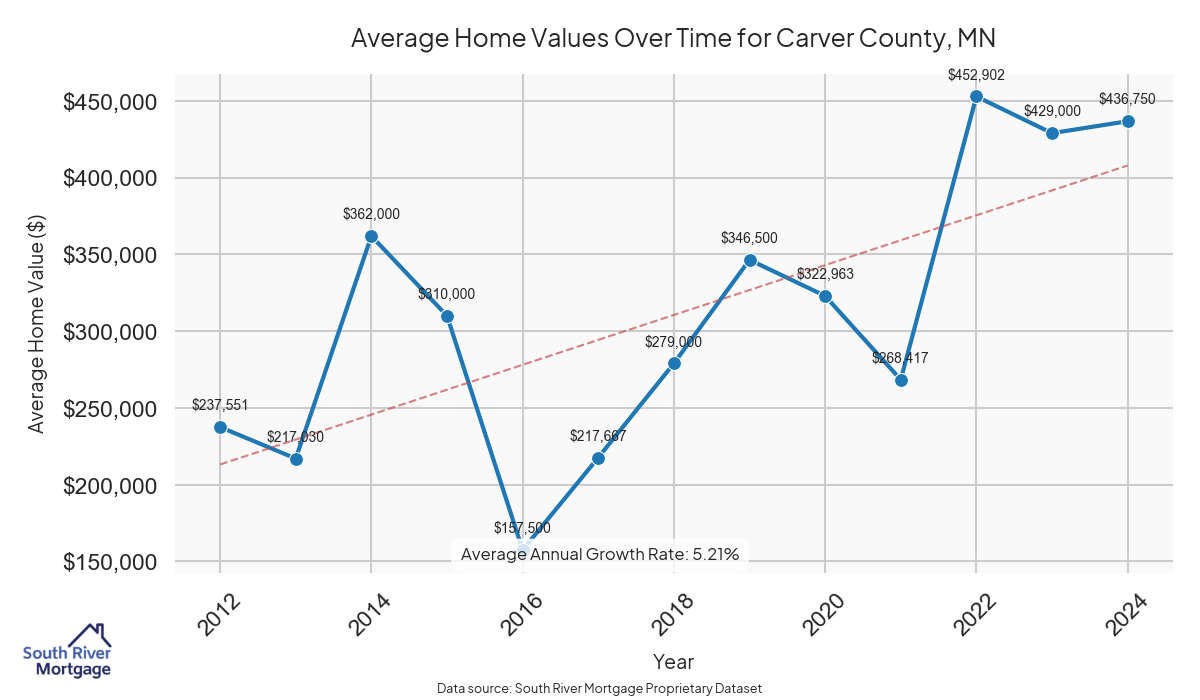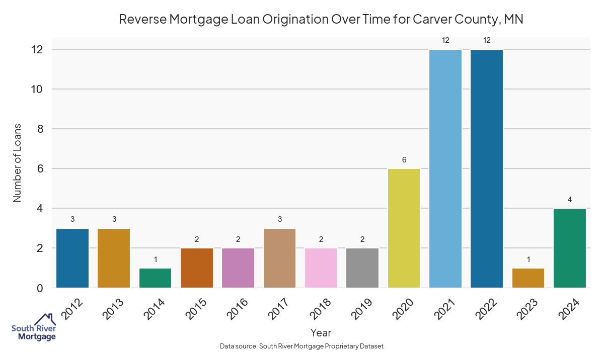 In 2024, there were 53 active reverse mortgage loans in Carver County, Minnesota. The average home value in Carver County is $549,382.13.