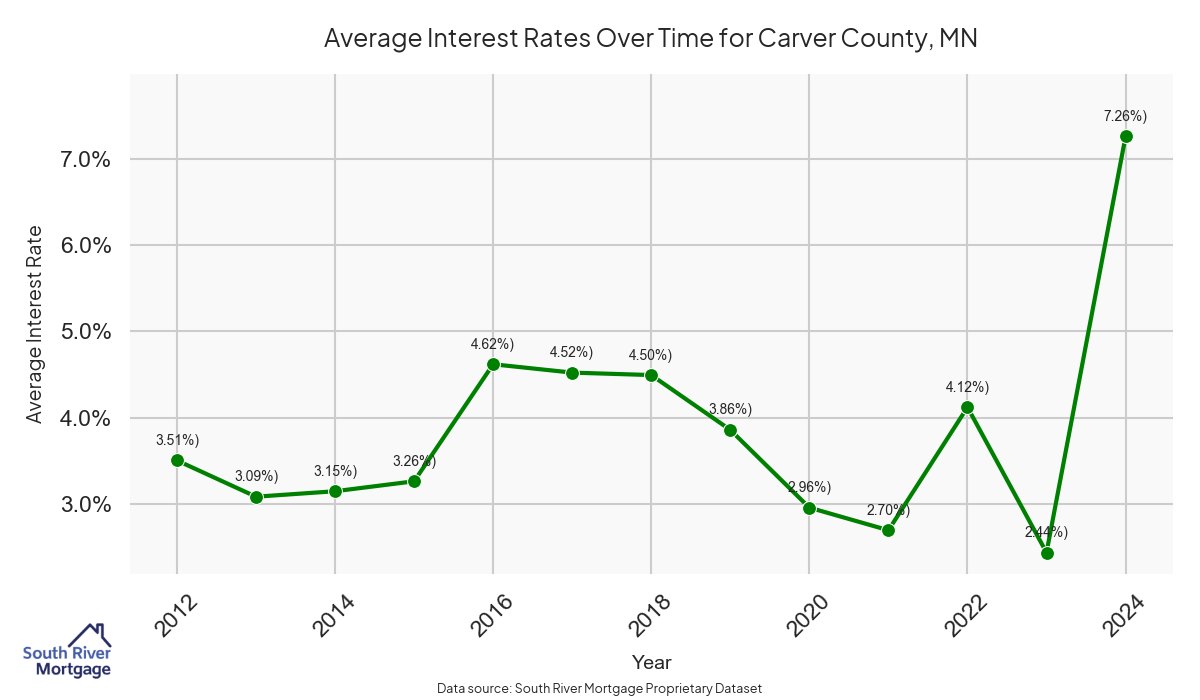 There are approximately 53 active reverse mortgage loans in Carver County. The average interest rate in Carver County is 7.68% for reverse mortgages. The average maximum claim amount (the lesser of the appraisal or lending limit), among reverse mortgage borrowers, in Carver County was $340,000.00 in 2024.