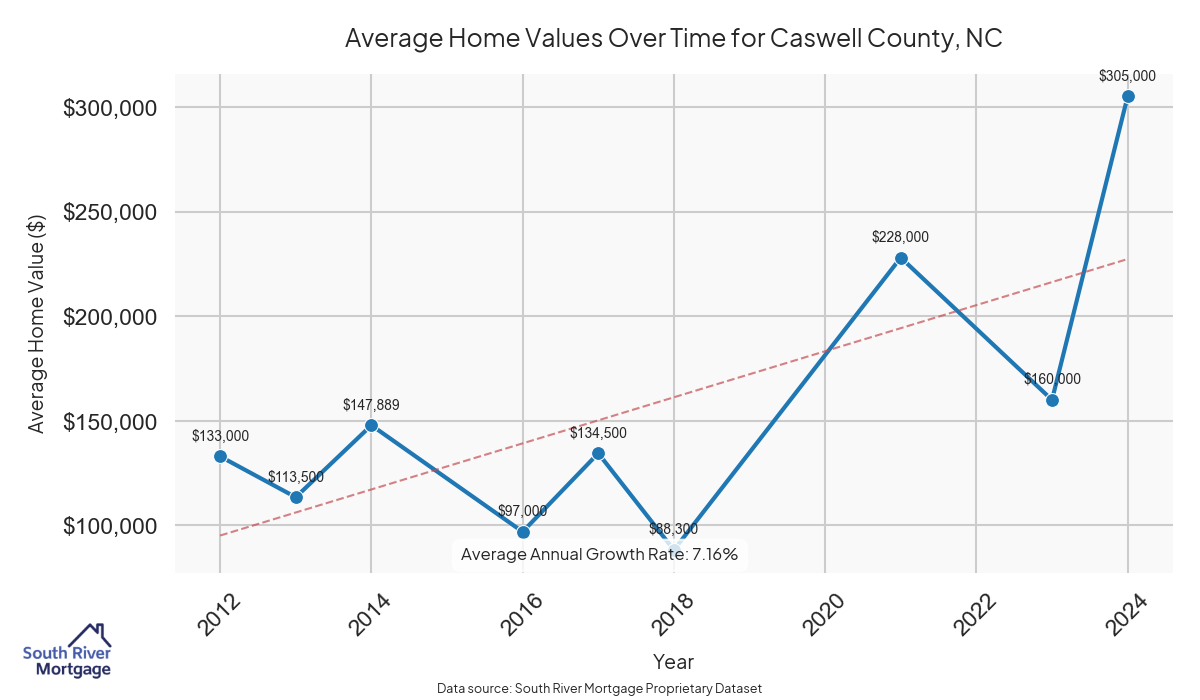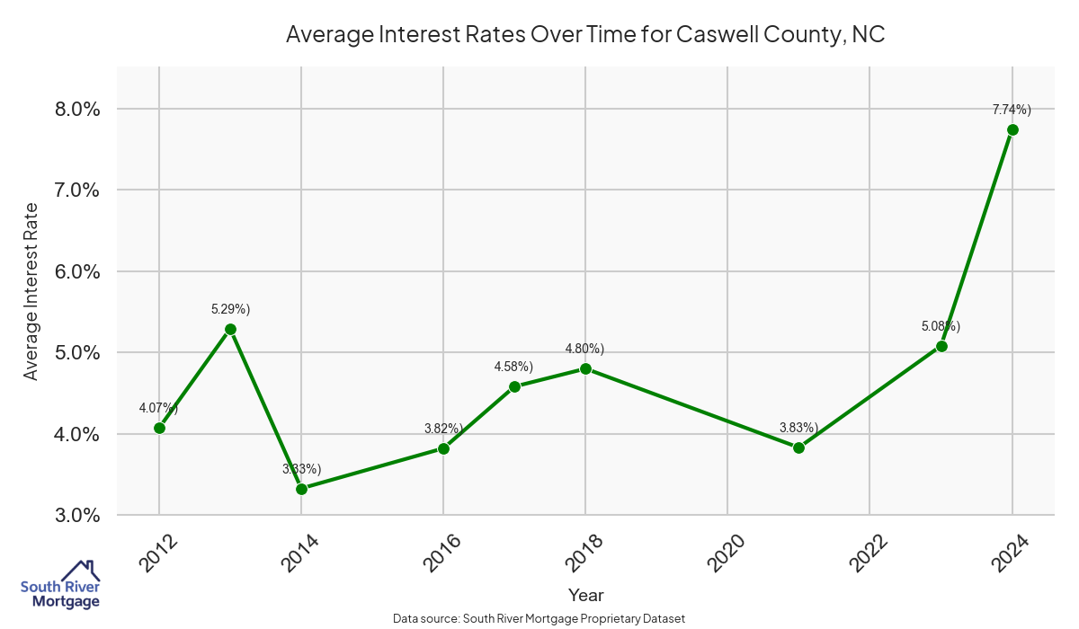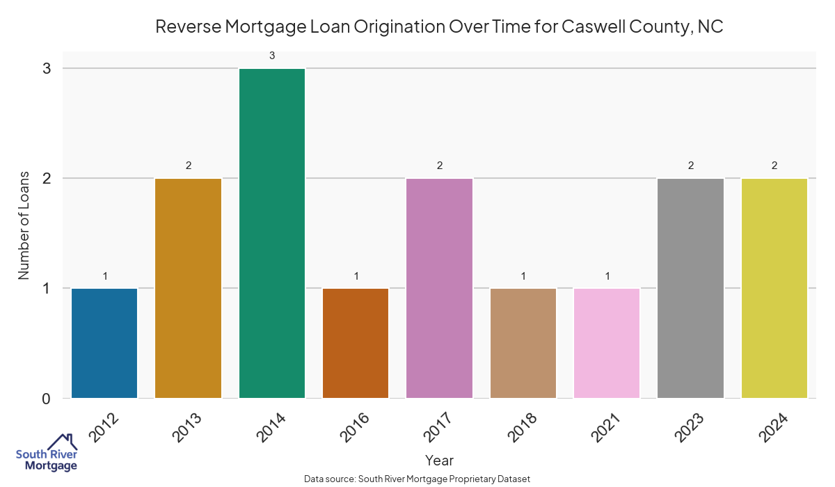 There are approximately 15 active reverse mortgage loans in Caswell County. The average interest rate in Caswell County is 7.28% for reverse mortgages. The average maximum claim amount (the lesser of the appraisal or lending limit), among reverse mortgage borrowers, in Caswell County was $215,000.00 in 2024.