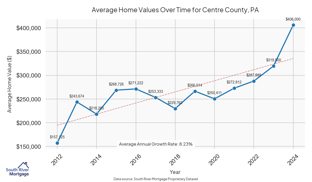 In 2024, there were 89 active reverse mortgage loans in Centre County, Pennsylvania. The average home value in Centre County is $367,396.88.