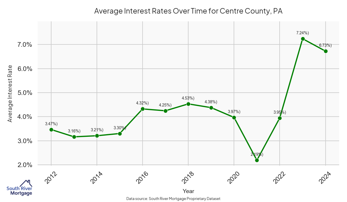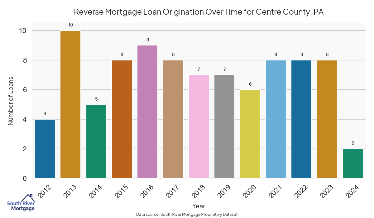 There are approximately 89 active reverse mortgage loans in Centre County. The average interest rate in Centre County is 7.99% for reverse mortgages. The average maximum claim amount (the lesser of the appraisal or lending limit), among reverse mortgage borrowers, in Centre County was $327,500.00 in 2024.