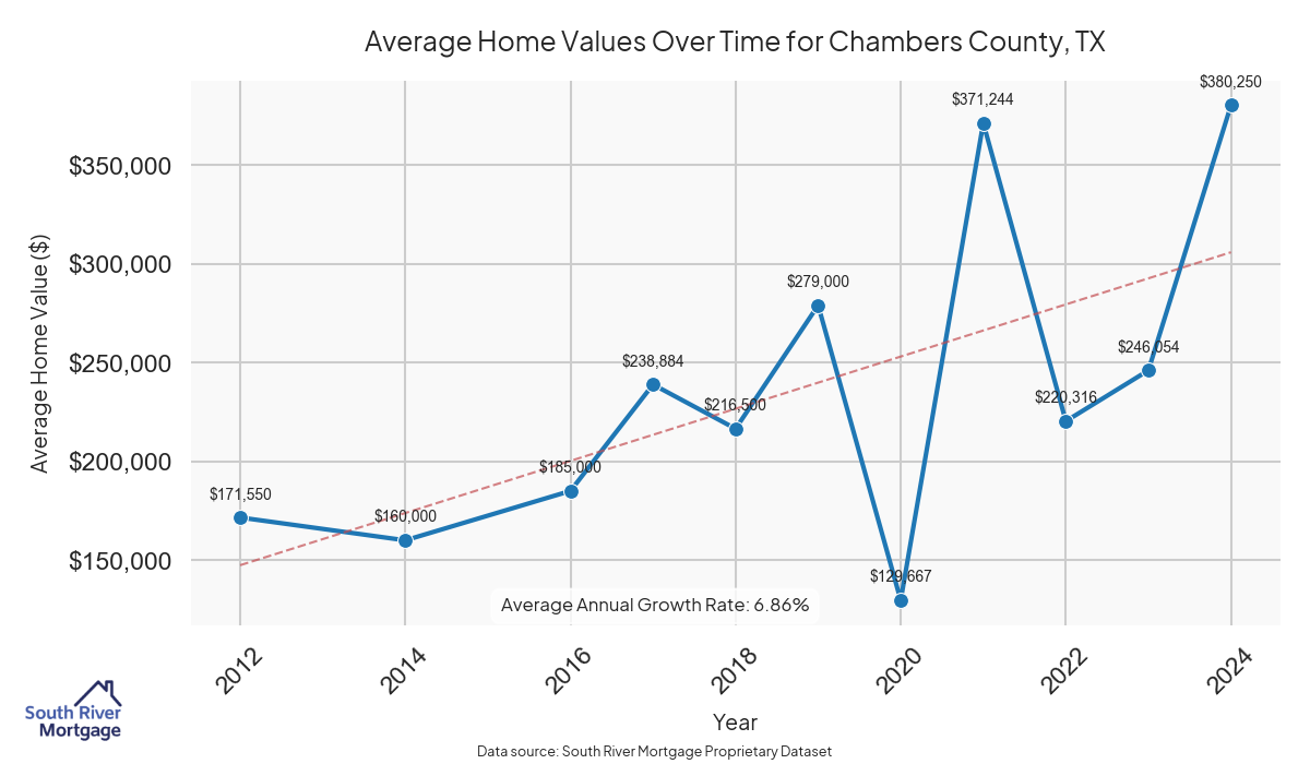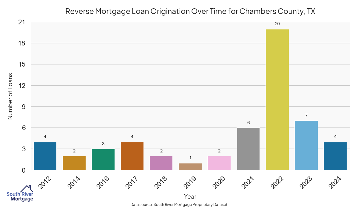 In 2024, there were 55 active reverse mortgage loans in Chambers County, Texas. The average home value in Chambers County is $359,137.71.