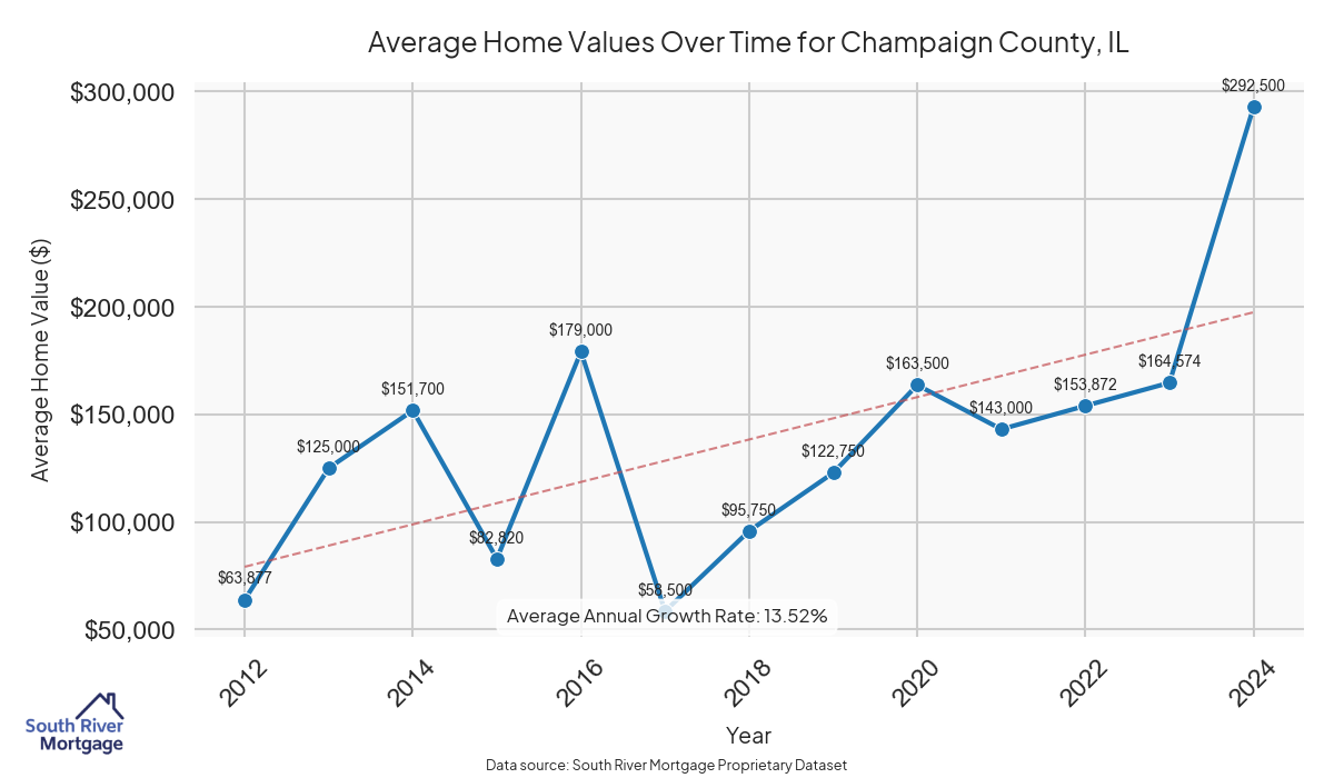 In 2024, there were 47 active reverse mortgage loans in Champaign County, Illinois. The average home value in Champaign County is $214,496.00.