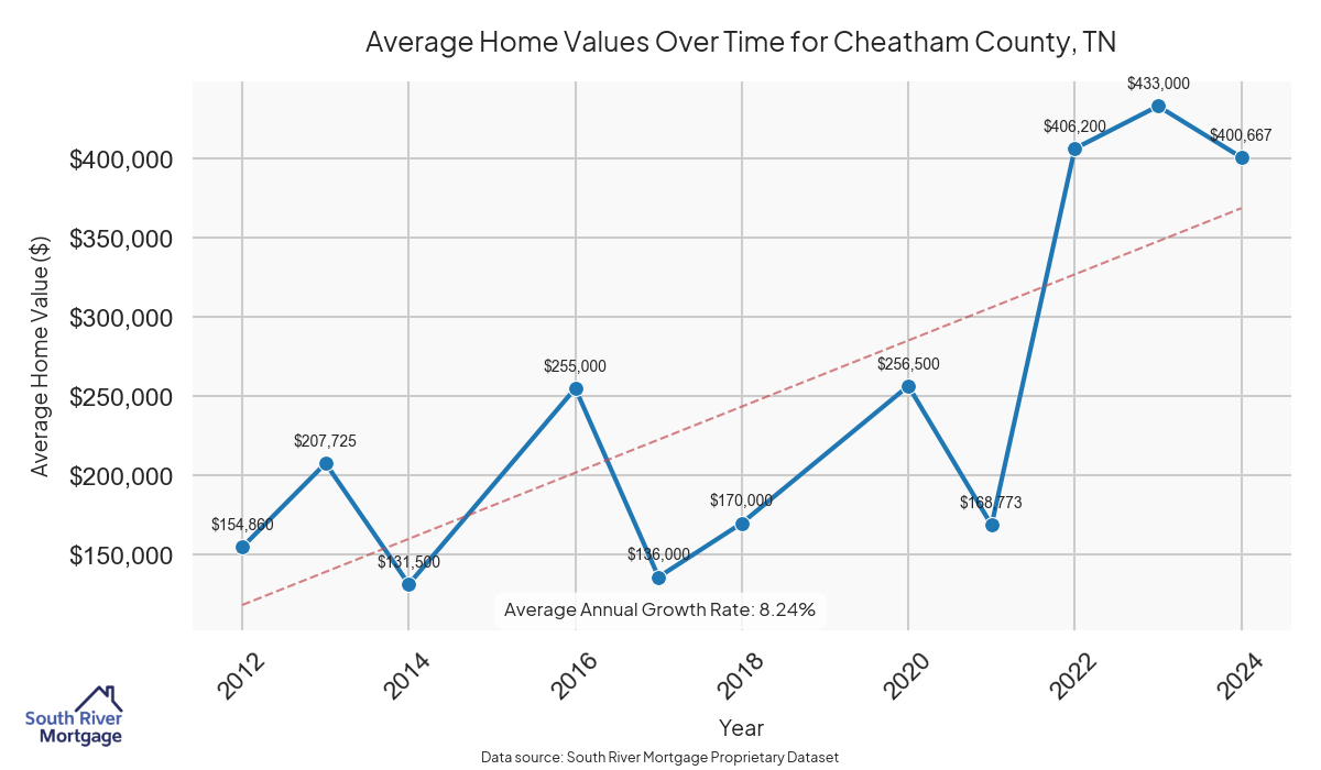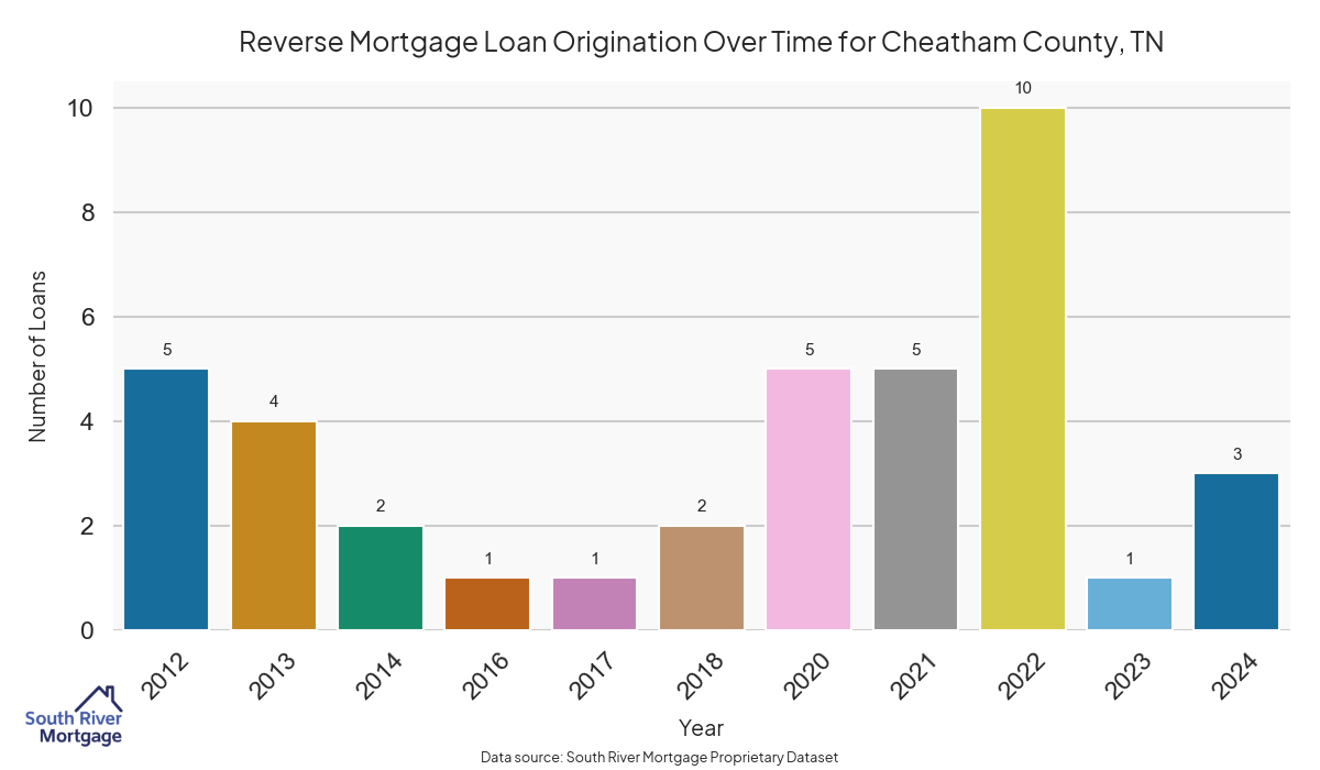 In 2024, there were 38 active reverse mortgage loans in Cheatham County, Tennessee. The average home value in Cheatham County is $409,996.32.