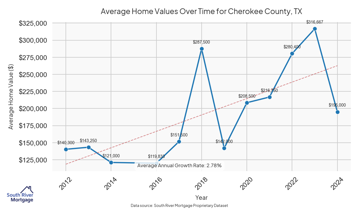 In 2024, there were 36 active reverse mortgage loans in Cherokee County, Texas. The average home value in Cherokee County is $311,684.86.