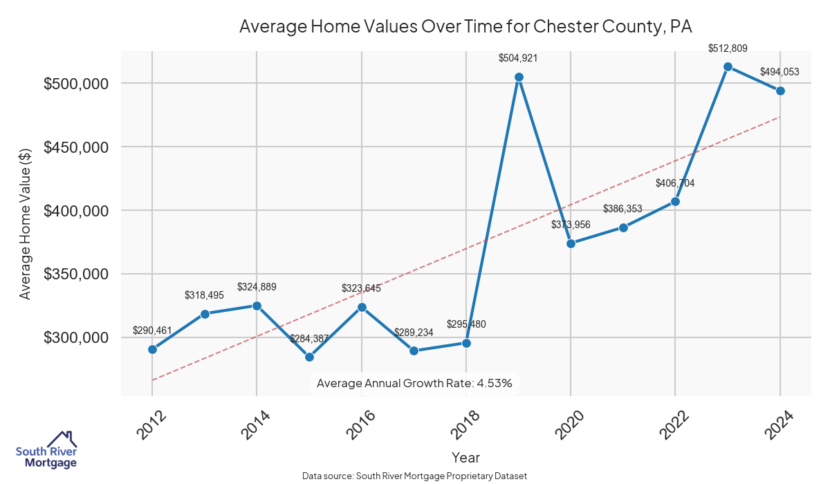 In 2024, there were 407 active reverse mortgage loans in Chester County, Pennsylvania. The average home value in Chester County is $549,071.79.
