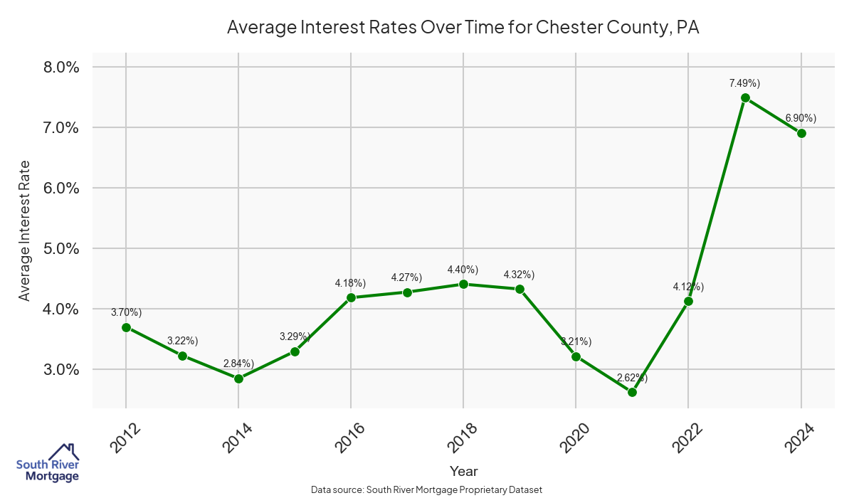 There are approximately 407 active reverse mortgage loans in Chester County. The average interest rate in Chester County is 7.51% for reverse mortgages. The average maximum claim amount (the lesser of the appraisal or lending limit), among reverse mortgage borrowers, in Chester County was $518,030.30 in 2024.