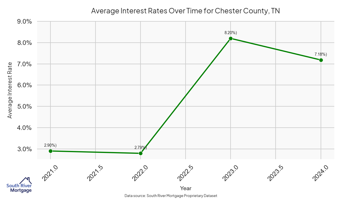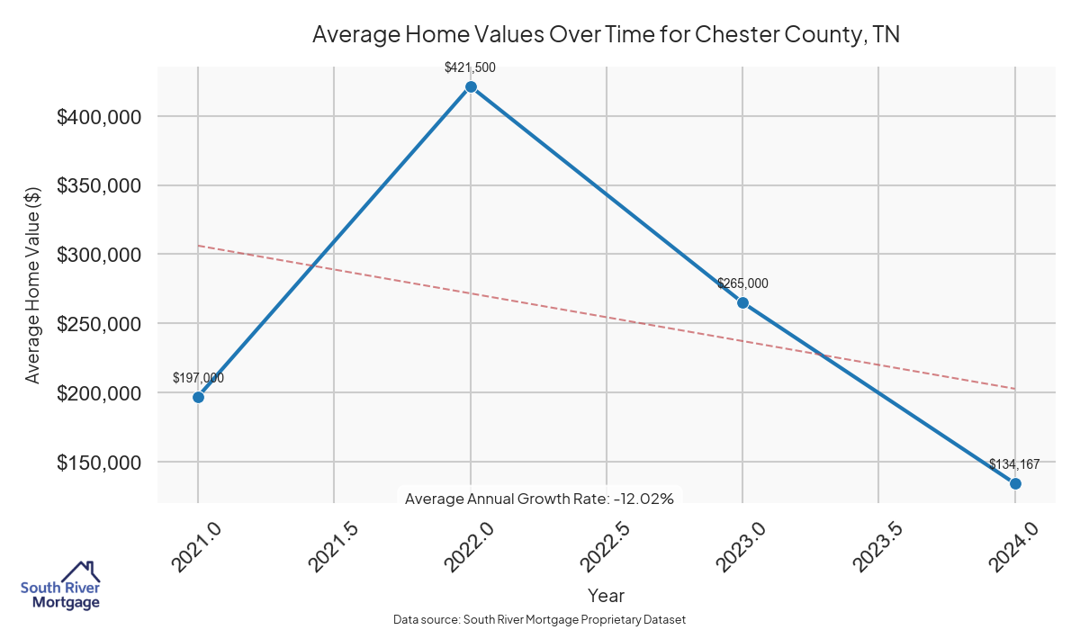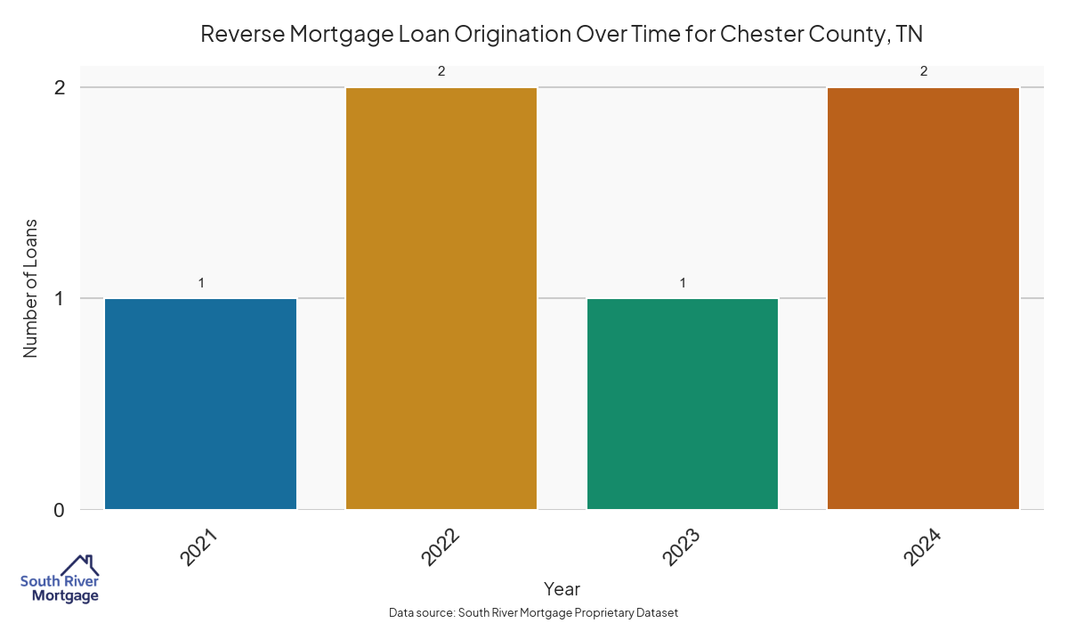 In 2024, there were 6 active reverse mortgage loans in Chester County, Tennessee. The average home value in Chester County is $311,575.17.