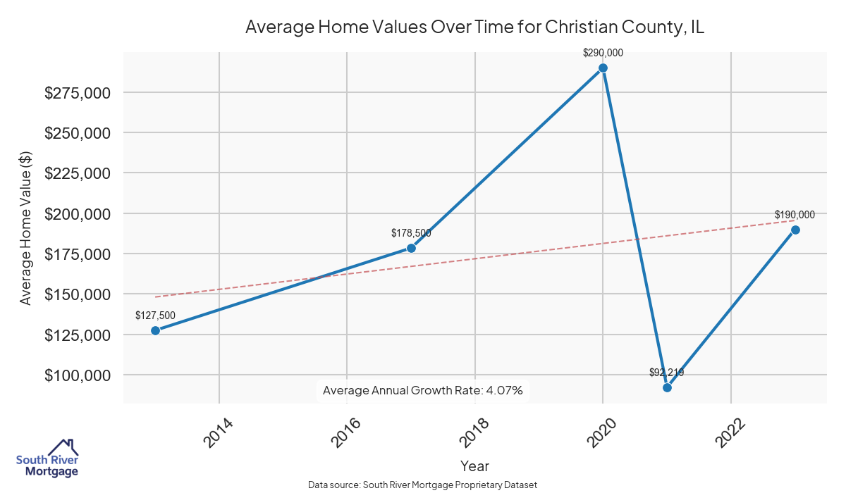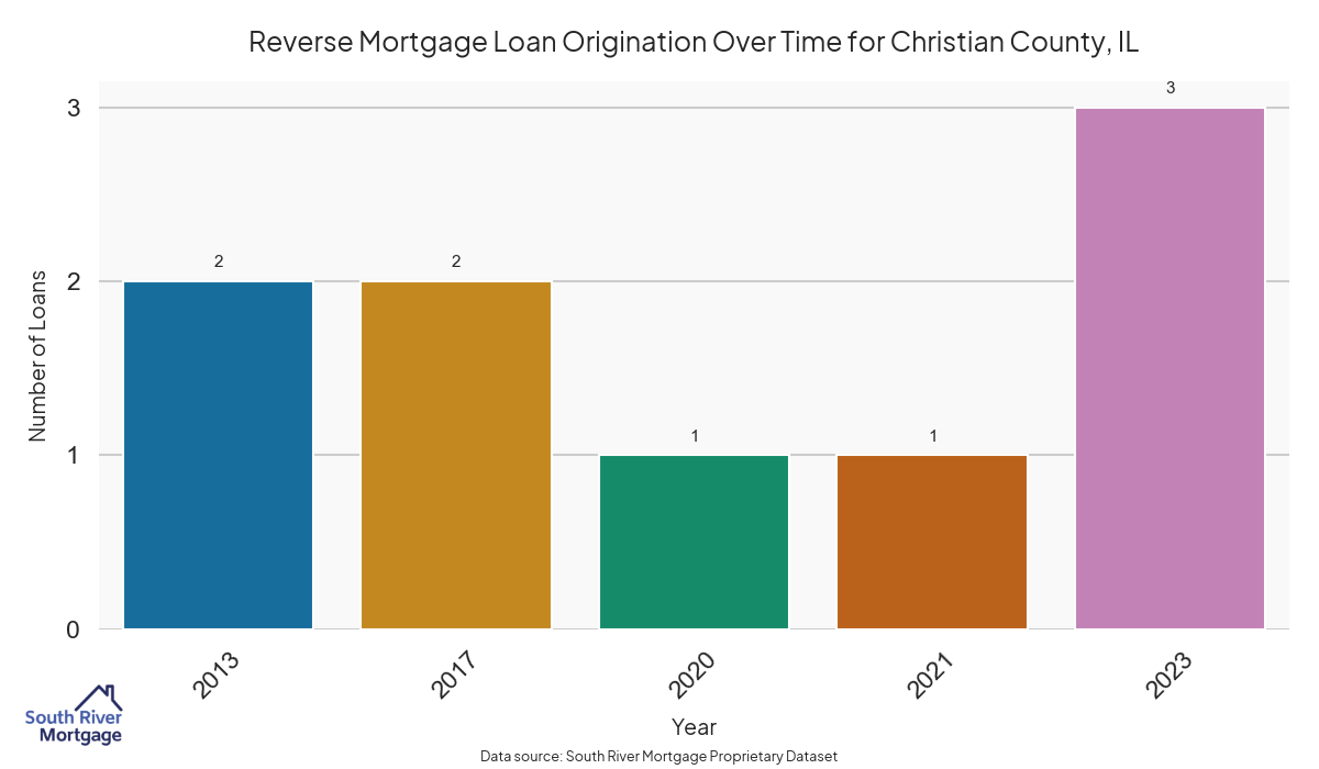In 2024, there were 9 active reverse mortgage loans in Christian County, Illinois. The average home value in Christian County is $224,899.44.