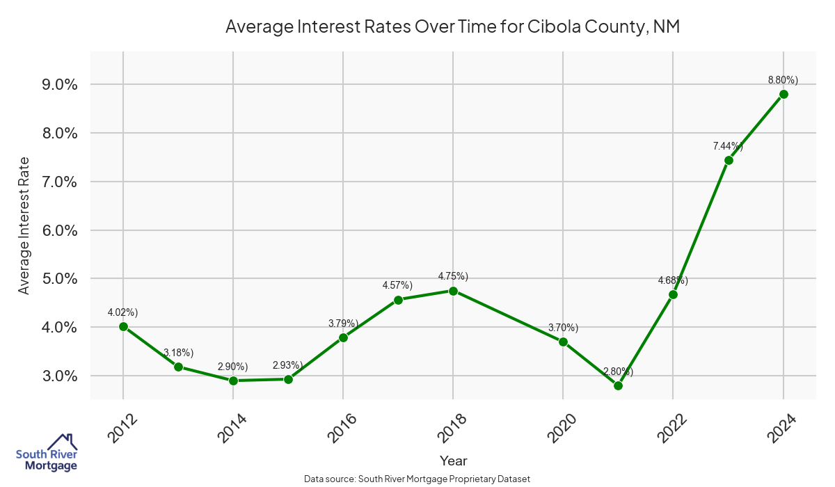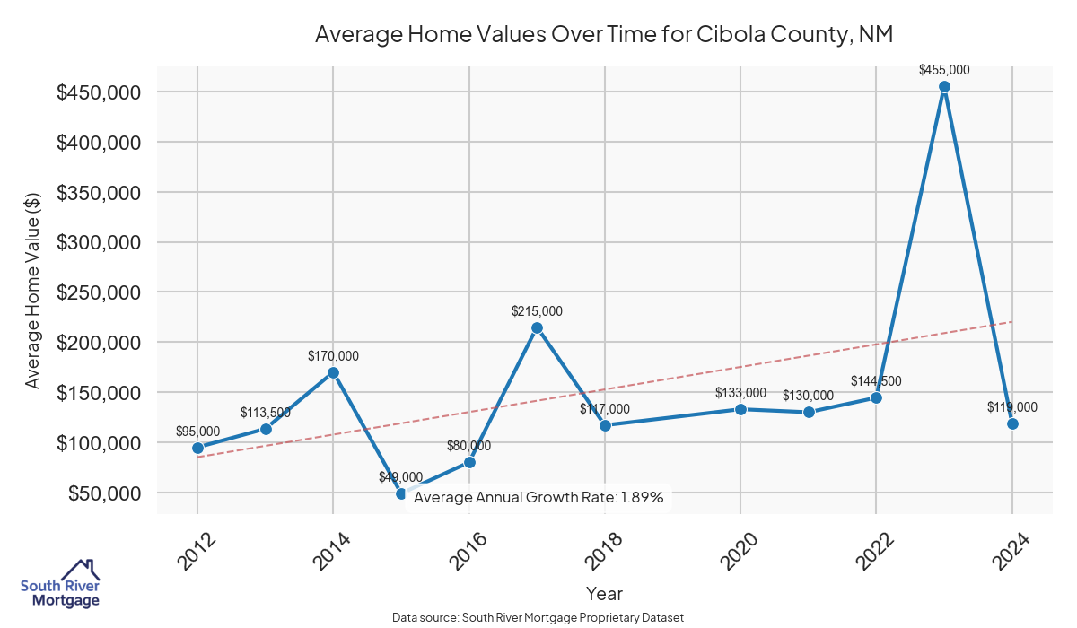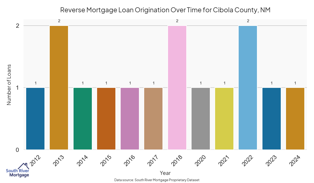 There are approximately 15 active reverse mortgage loans in Cibola County. The average interest rate in Cibola County is 7.44% for reverse mortgages. The average maximum claim amount (the lesser of the appraisal or lending limit), among reverse mortgage borrowers, in Cibola County was $455,000.00 in 2024.