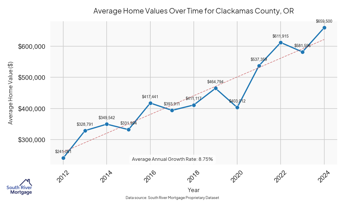 In 2024, there were 823 active reverse mortgage loans in Clackamas County, Oregon. The average home value in Clackamas County is $661,296.52.