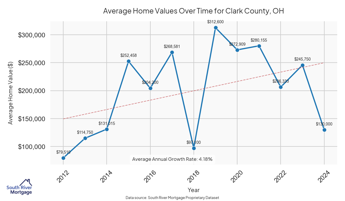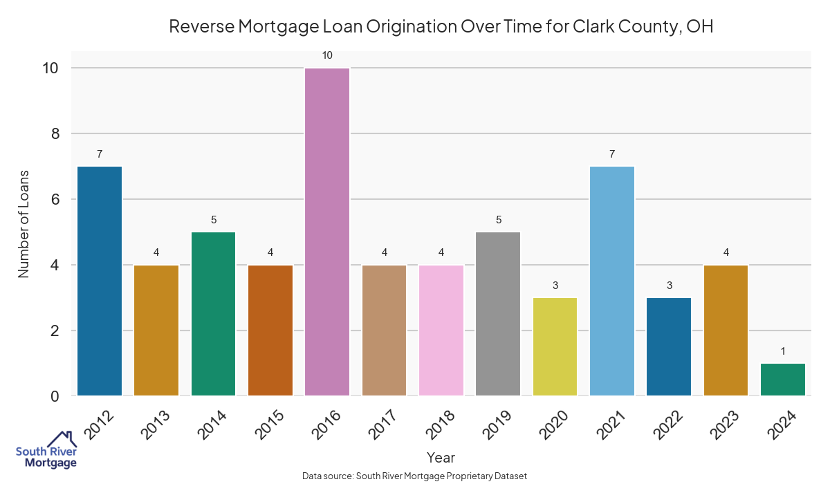In 2024, there were 57 active reverse mortgage loans in Clark County, Ohio. The average home value in Clark County is $267,742.86.