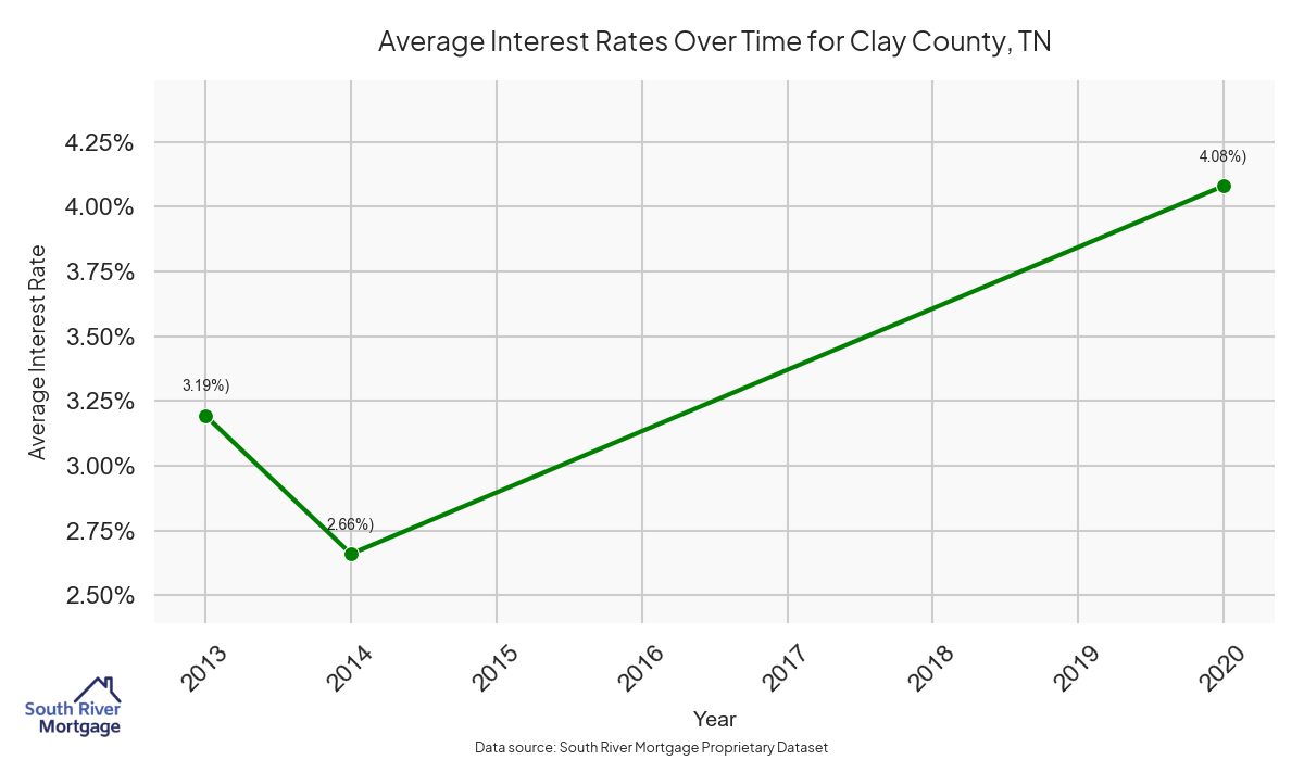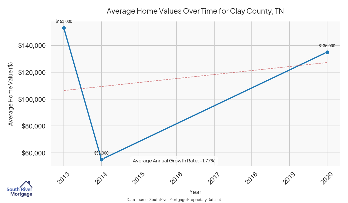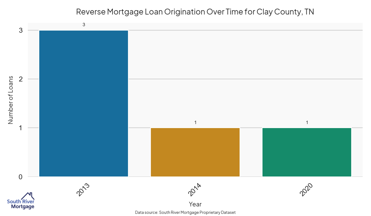 In 2024, there were 5 active reverse mortgage loans in Clay County, Tennessee. The average home value in Clay County is $198,958.00.