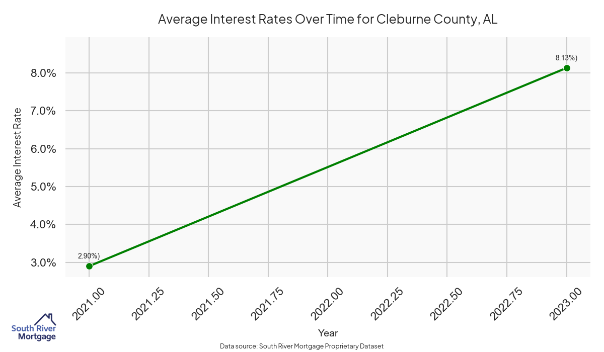 There are approximately 2 active reverse mortgage loans in Cleburne County. The average interest rate in Cleburne County is 8.13% for reverse mortgages. The average maximum claim amount (the lesser of the appraisal or lending limit), among reverse mortgage borrowers, in Cleburne County was $215,000.00 in 2024.