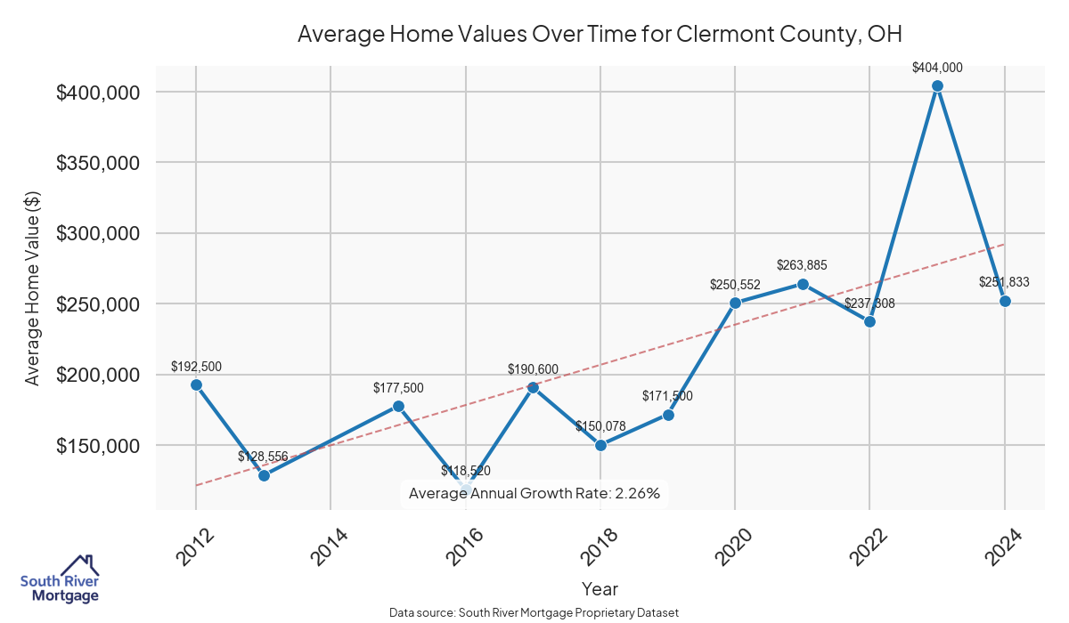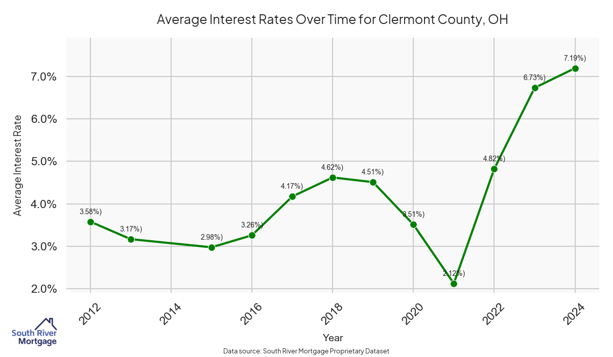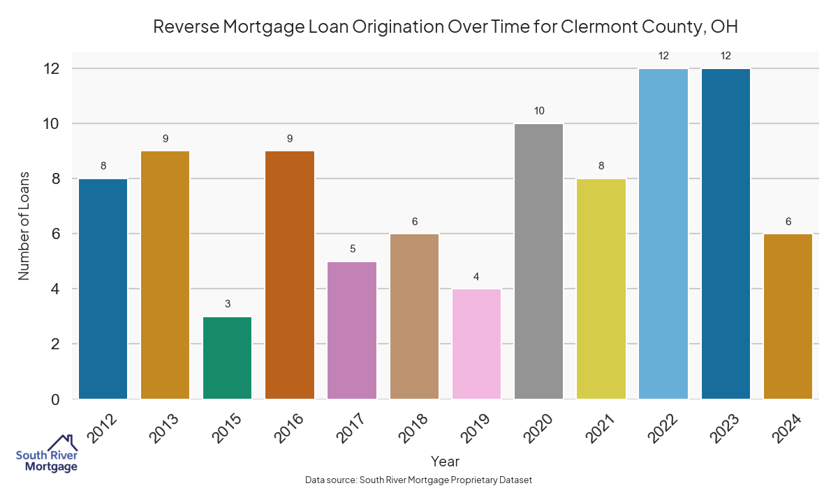 There are approximately 84 active reverse mortgage loans in Clermont County. The average interest rate in Clermont County is 7.4% for reverse mortgages. The average maximum claim amount (the lesser of the appraisal or lending limit), among reverse mortgage borrowers, in Clermont County was $415,000.00 in 2024.