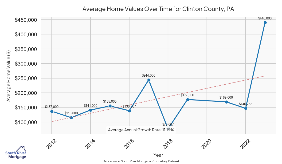 In 2024, there were 22 active reverse mortgage loans in Clinton County, Pennsylvania. The average home value in Clinton County is $248,633.23.