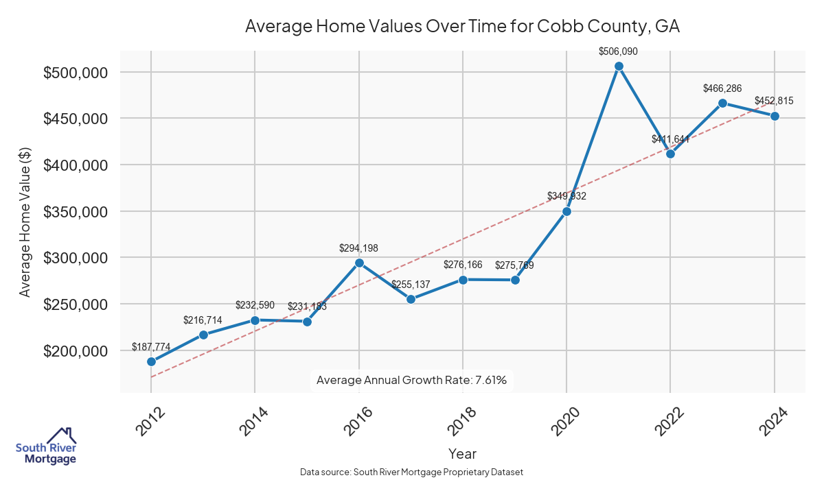 In 2024, there were 539 active reverse mortgage loans in Cobb County, Georgia. The average home value in Cobb County is $491,558.77.