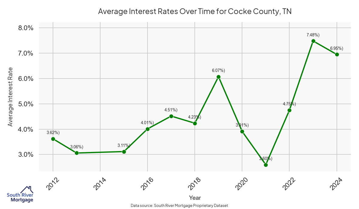 There are approximately 29 active reverse mortgage loans in Cocke County. The average interest rate in Cocke County is 6.74% for reverse mortgages. The average maximum claim amount (the lesser of the appraisal or lending limit), among reverse mortgage borrowers, in Cocke County was $318,333.33 in 2024.