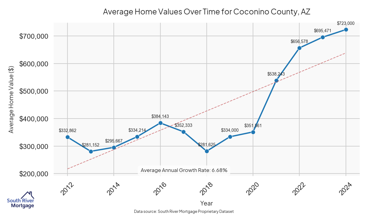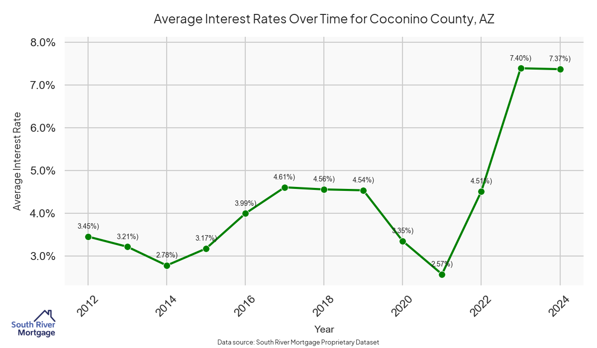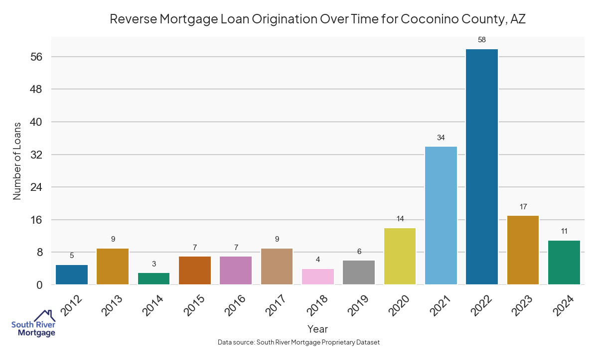 There are approximately 171 active reverse mortgage loans in Coconino County. The average interest rate in Coconino County is 7.56% for reverse mortgages. The average maximum claim amount (the lesser of the appraisal or lending limit), among reverse mortgage borrowers, in Coconino County was $723,260.87 in 2024.
