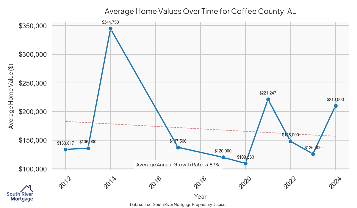 In 2024, there were 21 active reverse mortgage loans in Coffee County, Alabama. The average home value in Coffee County is $250,280.24.
