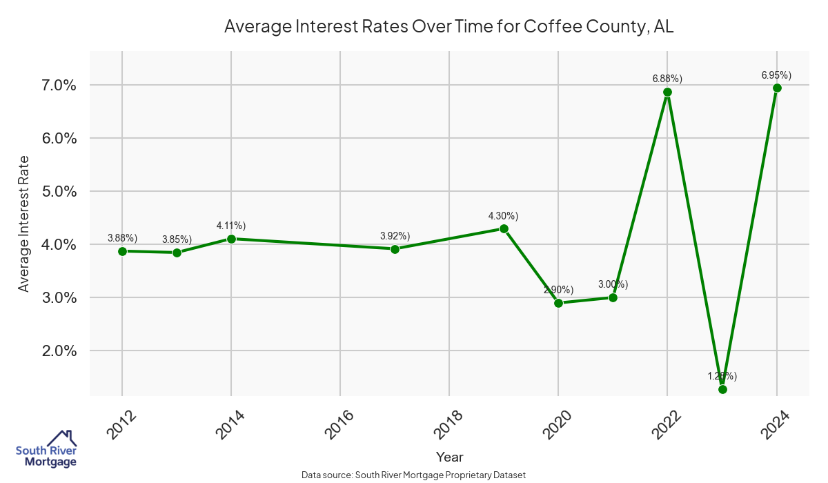 There are approximately 21 active reverse mortgage loans in Coffee County. The average interest rate in Coffee County is 7.15% for reverse mortgages. The average maximum claim amount (the lesser of the appraisal or lending limit), among reverse mortgage borrowers, in Coffee County was $170,000.00 in 2024.