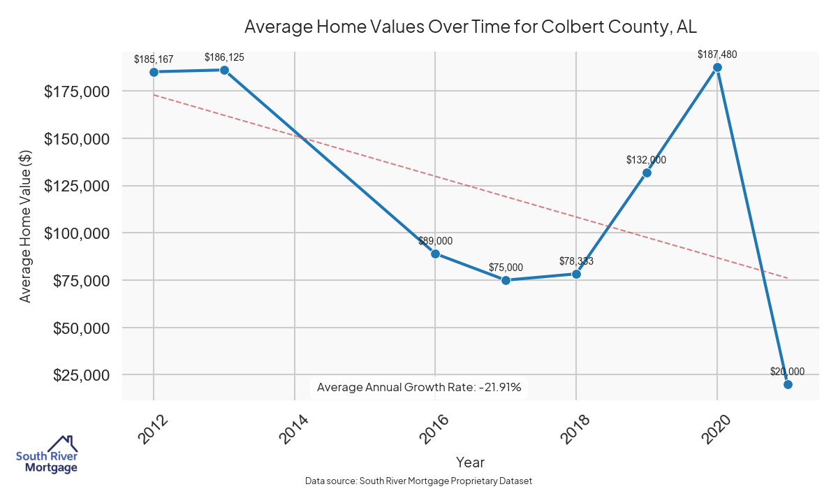 In 2024, there were 21 active reverse mortgage loans in Colbert County, Alabama. The average home value in Colbert County is $257,985.33.