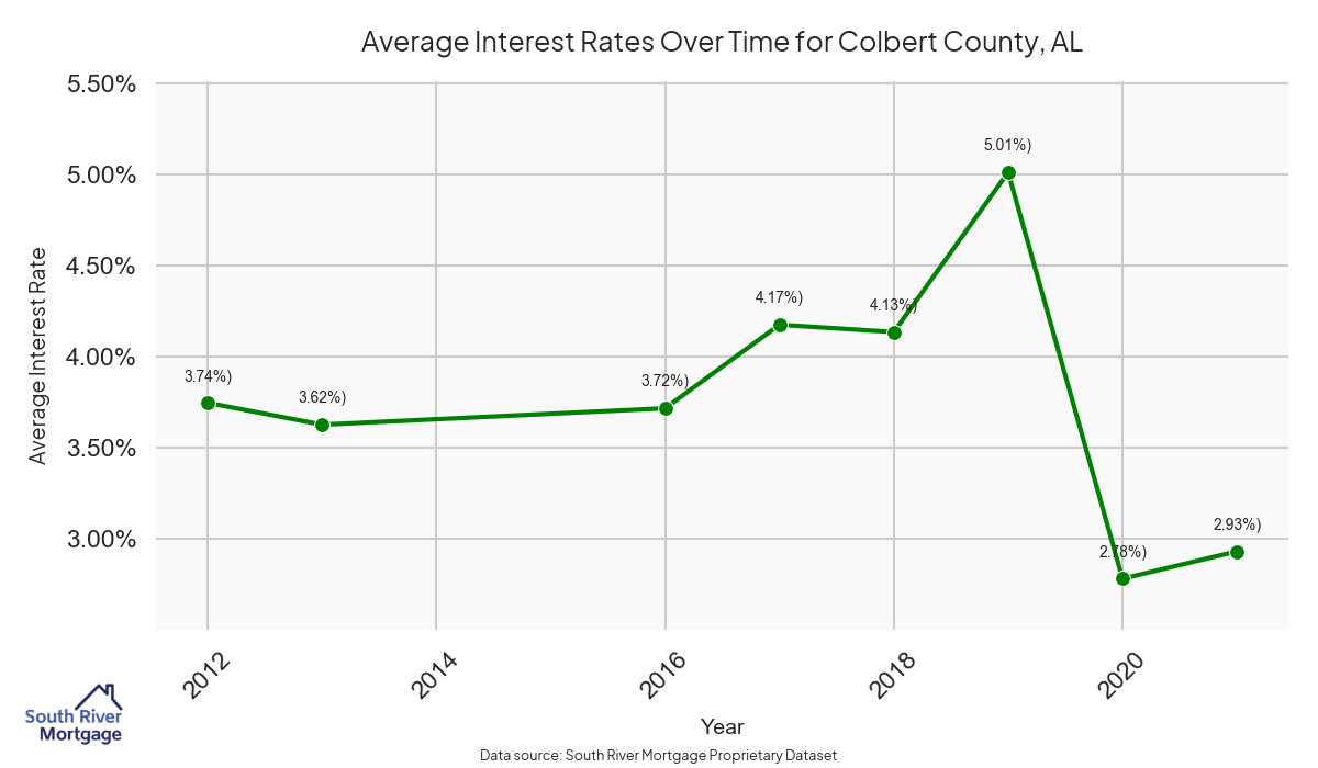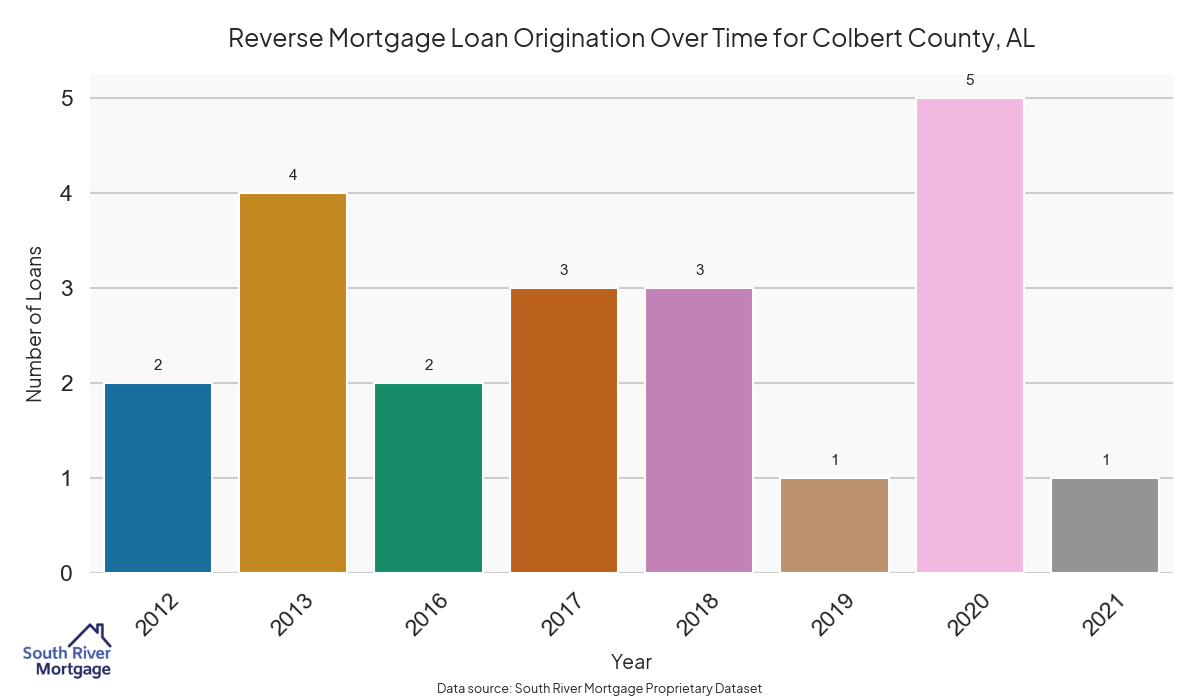 There are approximately 21 active reverse mortgage loans in Colbert County. The average interest rate in Colbert County is 6.99% for reverse mortgages. The average maximum claim amount (the lesser of the appraisal or lending limit), among reverse mortgage borrowers, in Colbert County was $220,000.00 in 2024.