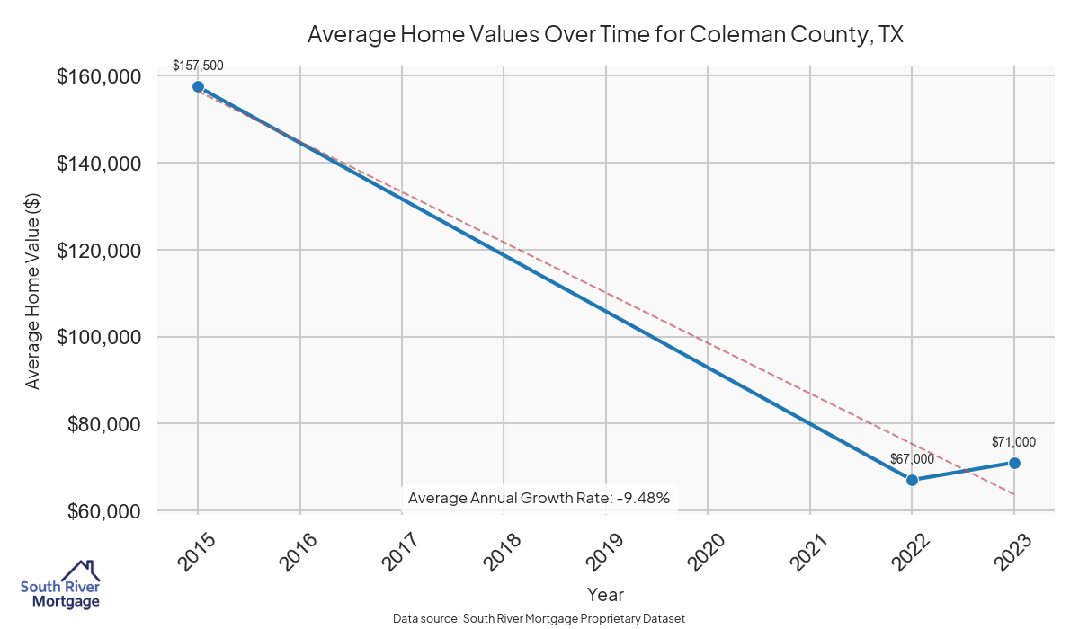 In 2024, there were 3 active reverse mortgage loans in Coleman County, Texas. The average home value in Coleman County is $30,973.33.