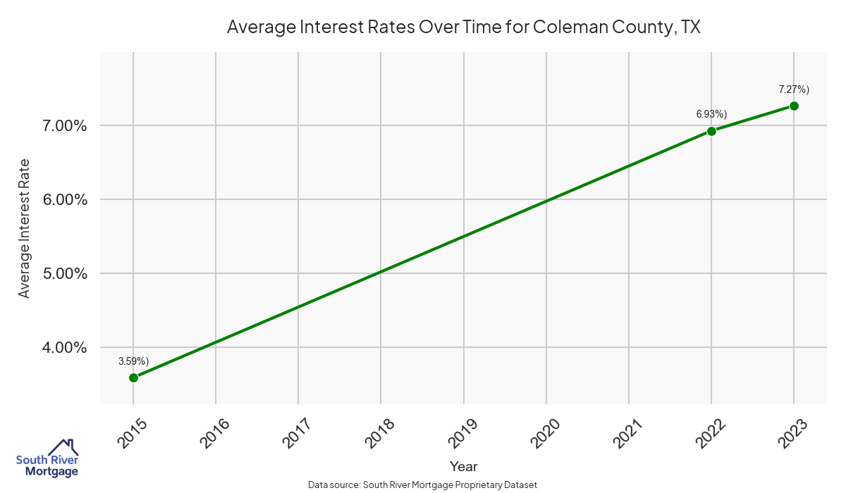 There are approximately 3 active reverse mortgage loans in Coleman County. The average interest rate in Coleman County is 7.27% for reverse mortgages. The average maximum claim amount (the lesser of the appraisal or lending limit), among reverse mortgage borrowers, in Coleman County was $75,000.00 in 2024.
