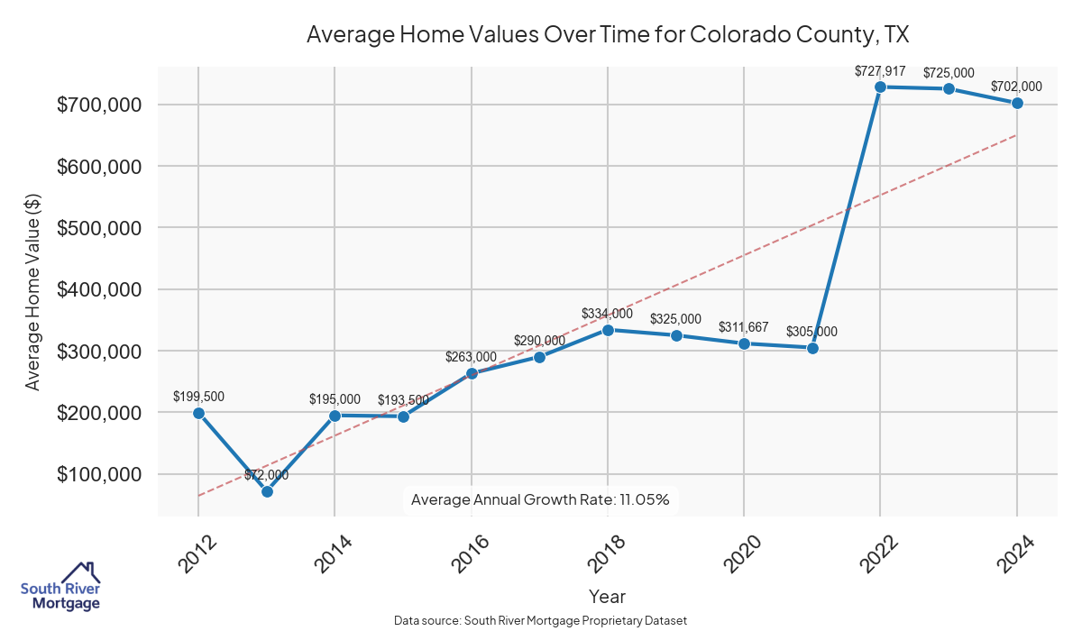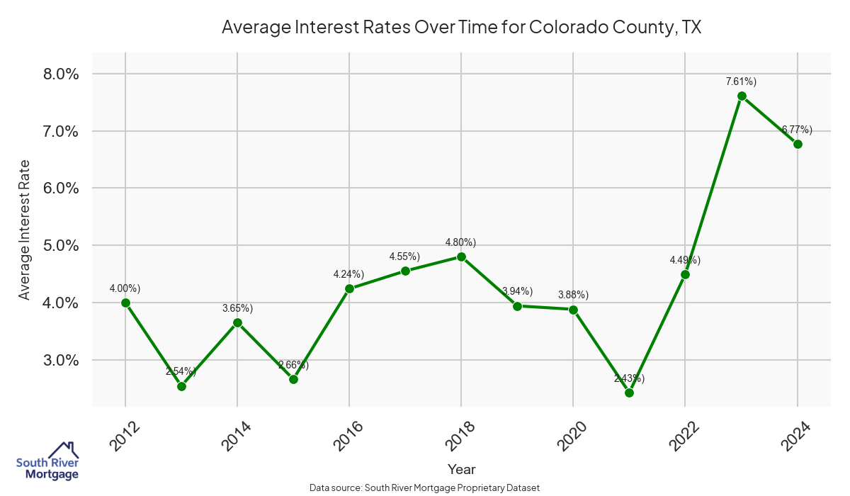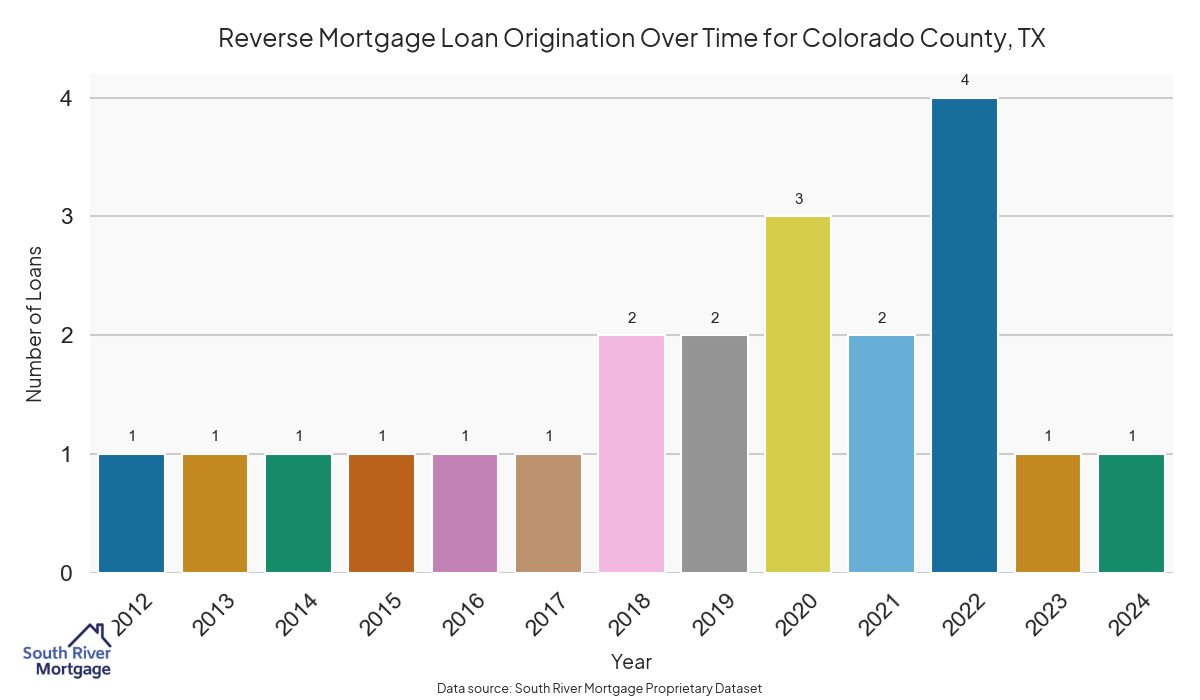 There are approximately 20 active reverse mortgage loans in Colorado County. The average interest rate in Colorado County is 7.4% for reverse mortgages. The average maximum claim amount (the lesser of the appraisal or lending limit), among reverse mortgage borrowers, in Colorado County was $425,000.00 in 2024.