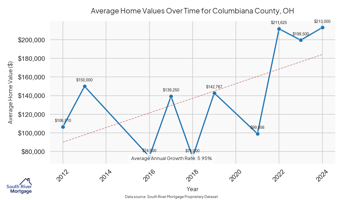 In 2024, there were 36 active reverse mortgage loans in Columbiana County, Ohio. The average home value in Columbiana County is $170,985.78.