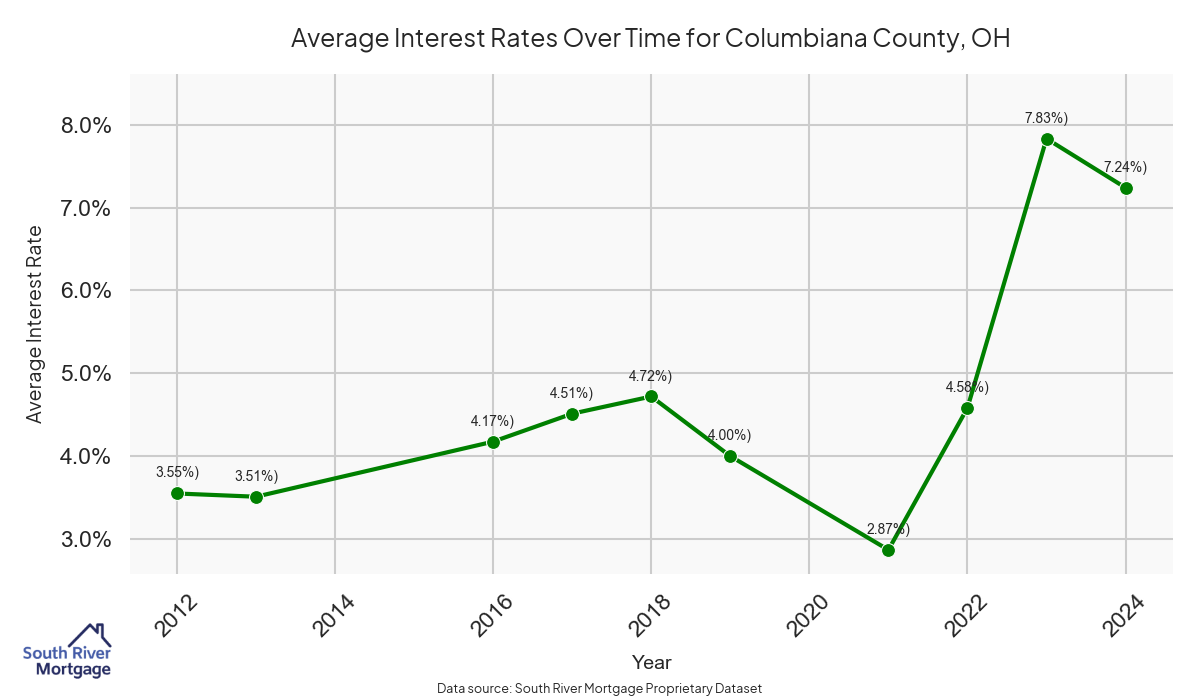 There are approximately 36 active reverse mortgage loans in Columbiana County. The average interest rate in Columbiana County is 7.78% for reverse mortgages. The average maximum claim amount (the lesser of the appraisal or lending limit), among reverse mortgage borrowers, in Columbiana County was $146,666.67 in 2024.