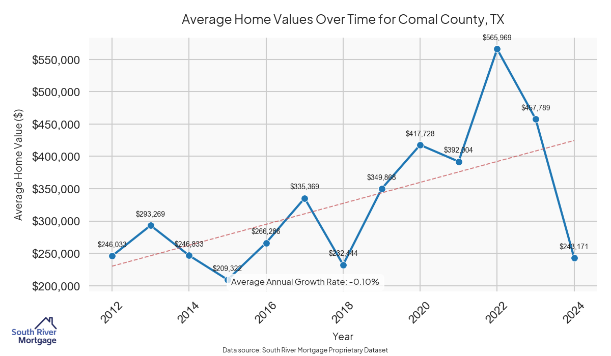 In 2024, there were 202 active reverse mortgage loans in Comal County, Texas. The average home value in Comal County is $543,713.05.