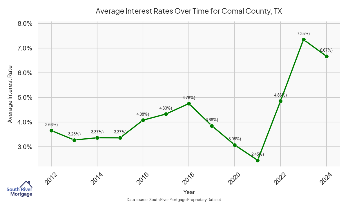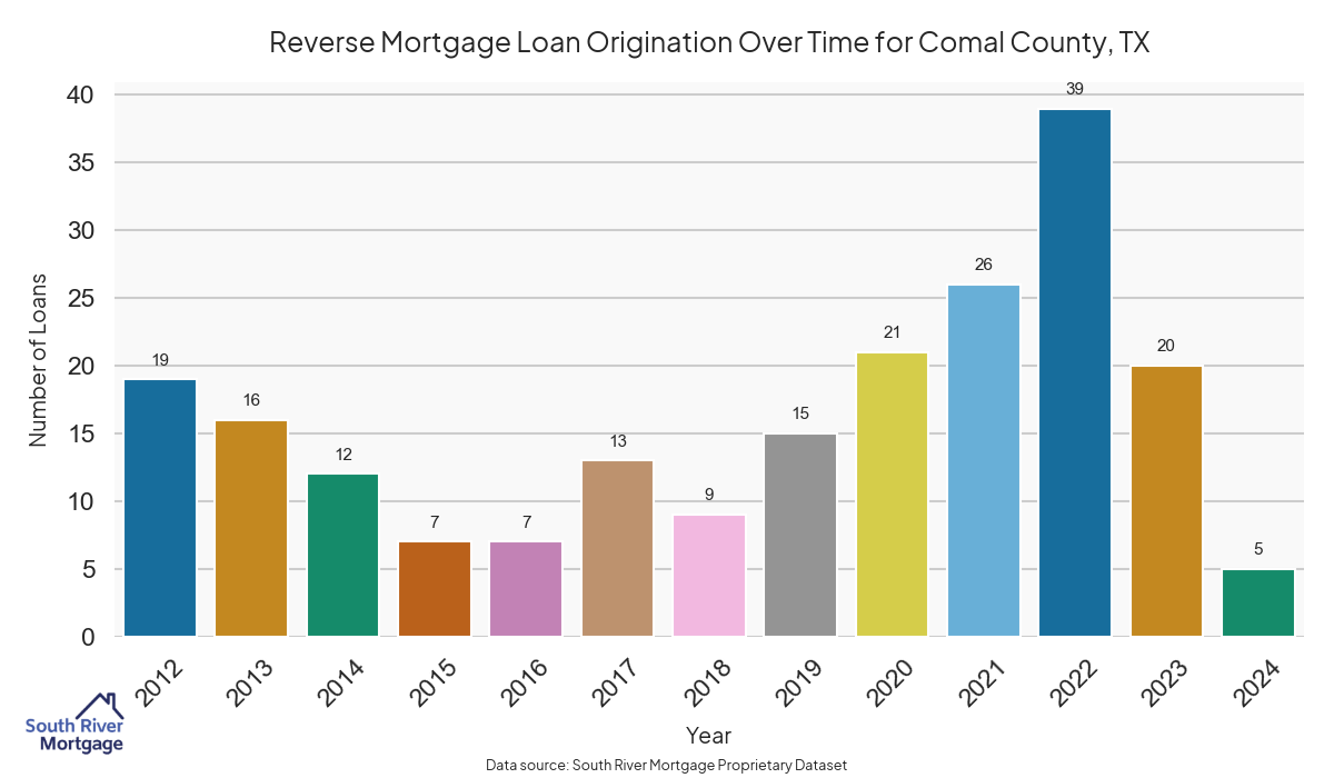 There are approximately 202 active reverse mortgage loans in Comal County. The average interest rate in Comal County is 7.74% for reverse mortgages. The average maximum claim amount (the lesser of the appraisal or lending limit), among reverse mortgage borrowers, in Comal County was $467,500.00 in 2024.