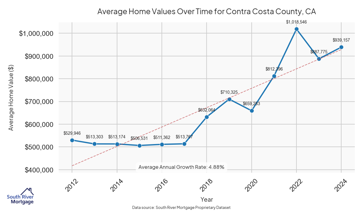 In 2024, there were 2406 active reverse mortgage loans in Contra Costa County, California. The average home value in Contra Costa County is $922,773.27.