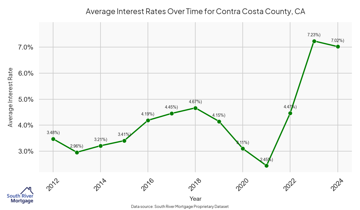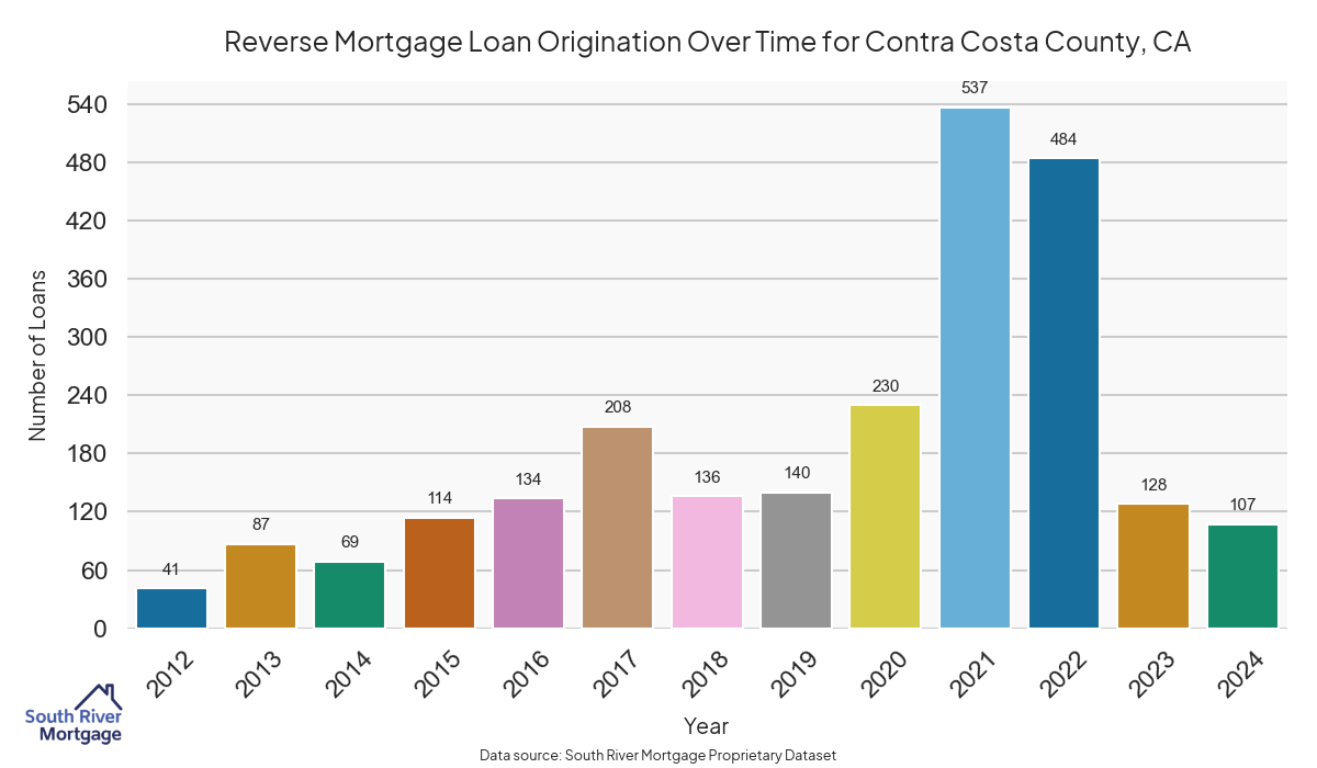 There are approximately 2406 active reverse mortgage loans in Contra Costa County. The average interest rate in Contra Costa County is 7.86% for reverse mortgages. The average maximum claim amount (the lesser of the appraisal or lending limit), among reverse mortgage borrowers, in Contra Costa County was $1,035,732.76 in 2024.
