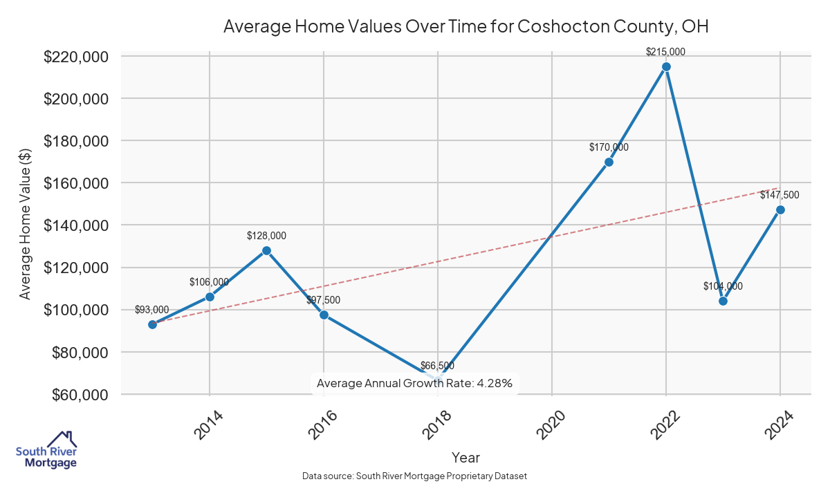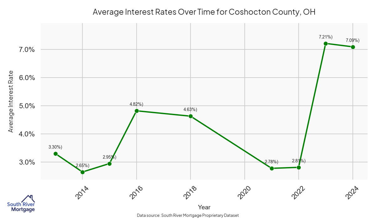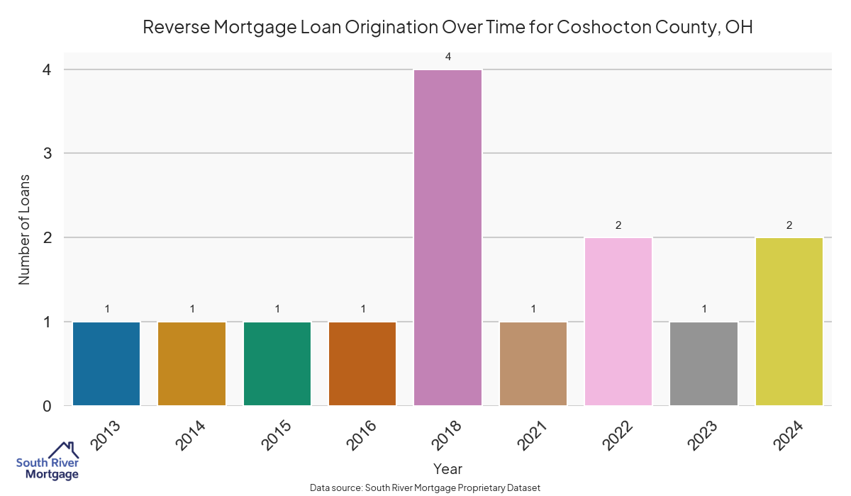 There are approximately 12 active reverse mortgage loans in Coshocton County. The average interest rate in Coshocton County is 7.21% for reverse mortgages. The average maximum claim amount (the lesser of the appraisal or lending limit), among reverse mortgage borrowers, in Coshocton County was $105,000.00 in 2024.